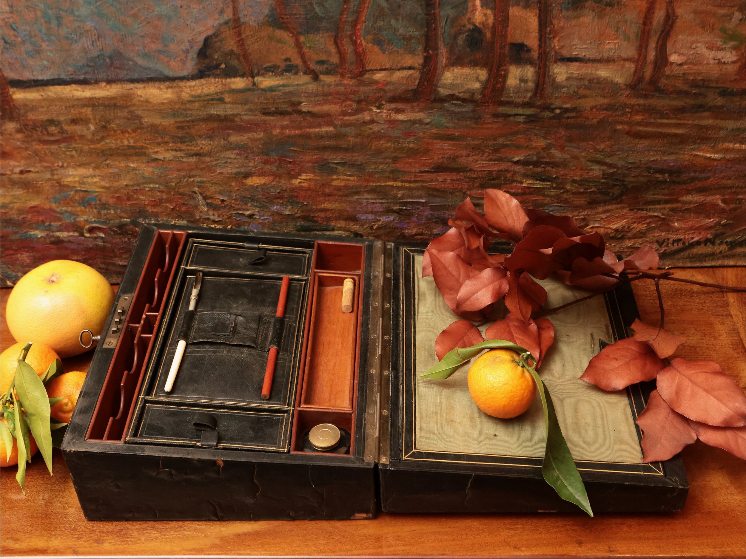 Scrittoio da viaggio rivestiro in cuoi verde lumeggiato in oro