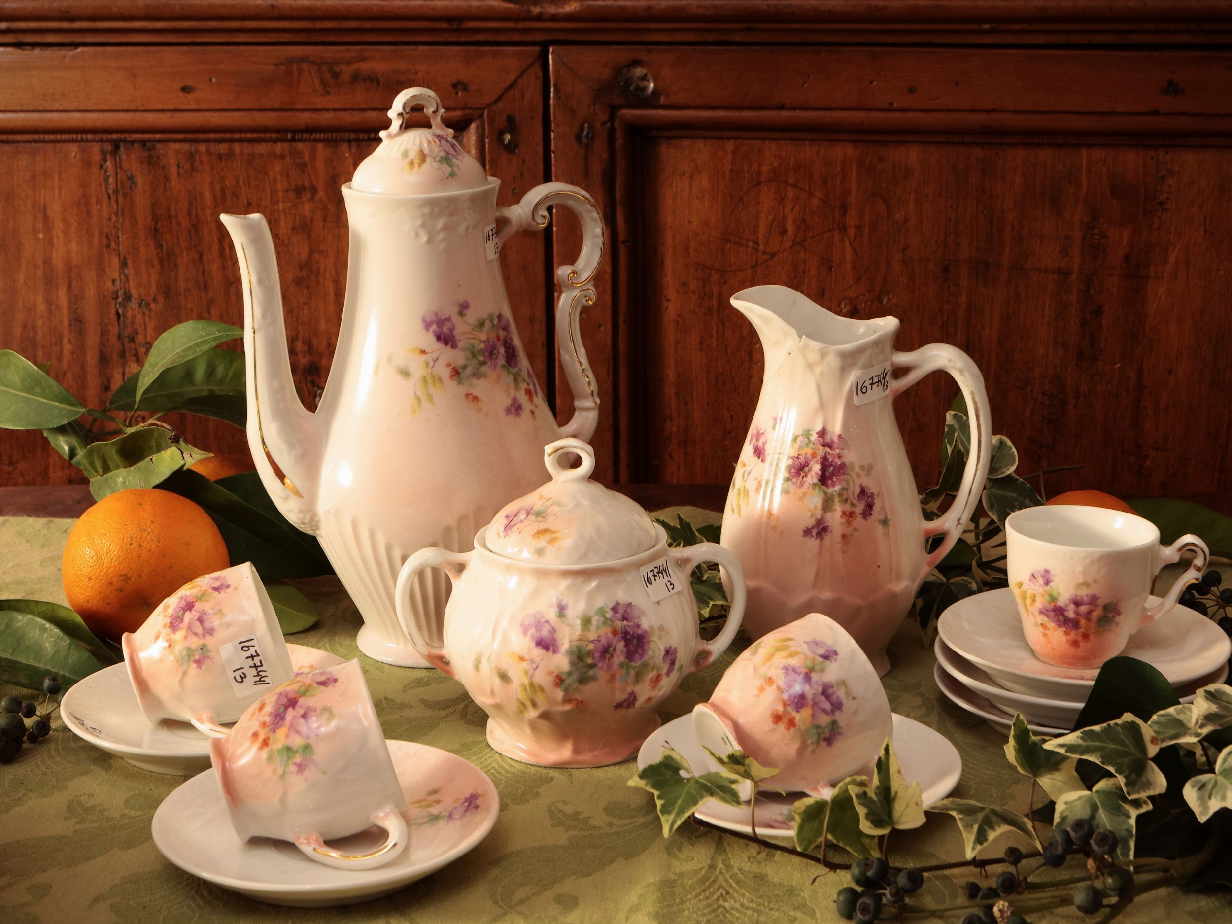 fine del XIX/inizio del XX secolo dipinto nei toni del rosa con fiori, composto da caffettiera, lattiera, zuccheriera e serie di quattro tazzine corredate da piattino (altri due di riserva), alcuni difetti