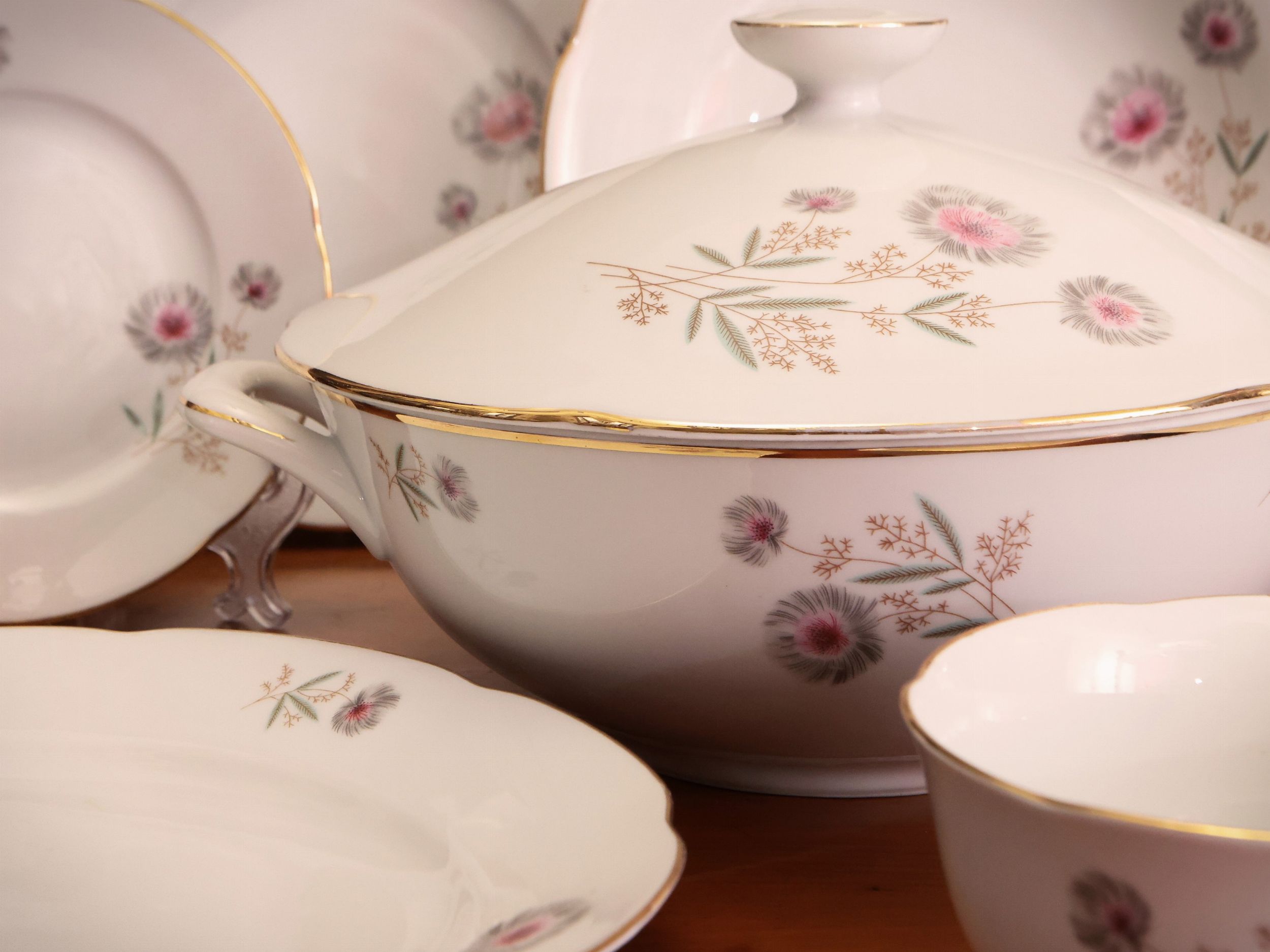 Anni Sessanta decorato con motivo floreale stilizzato nei toni del rosa e del grigio, bordo lumeggiato in oro, composto 36 piatti piani, 11 fondi, 11 da dolce, zuppiera, 2 insalatiere, 3 vassoi ovali a scalare, 2 salsiere a coppa di cui una con piattino, corredato da servizio da tè composti da teiera, lattiera, zuccheriera e 12 tazze da tè con 11 piattini