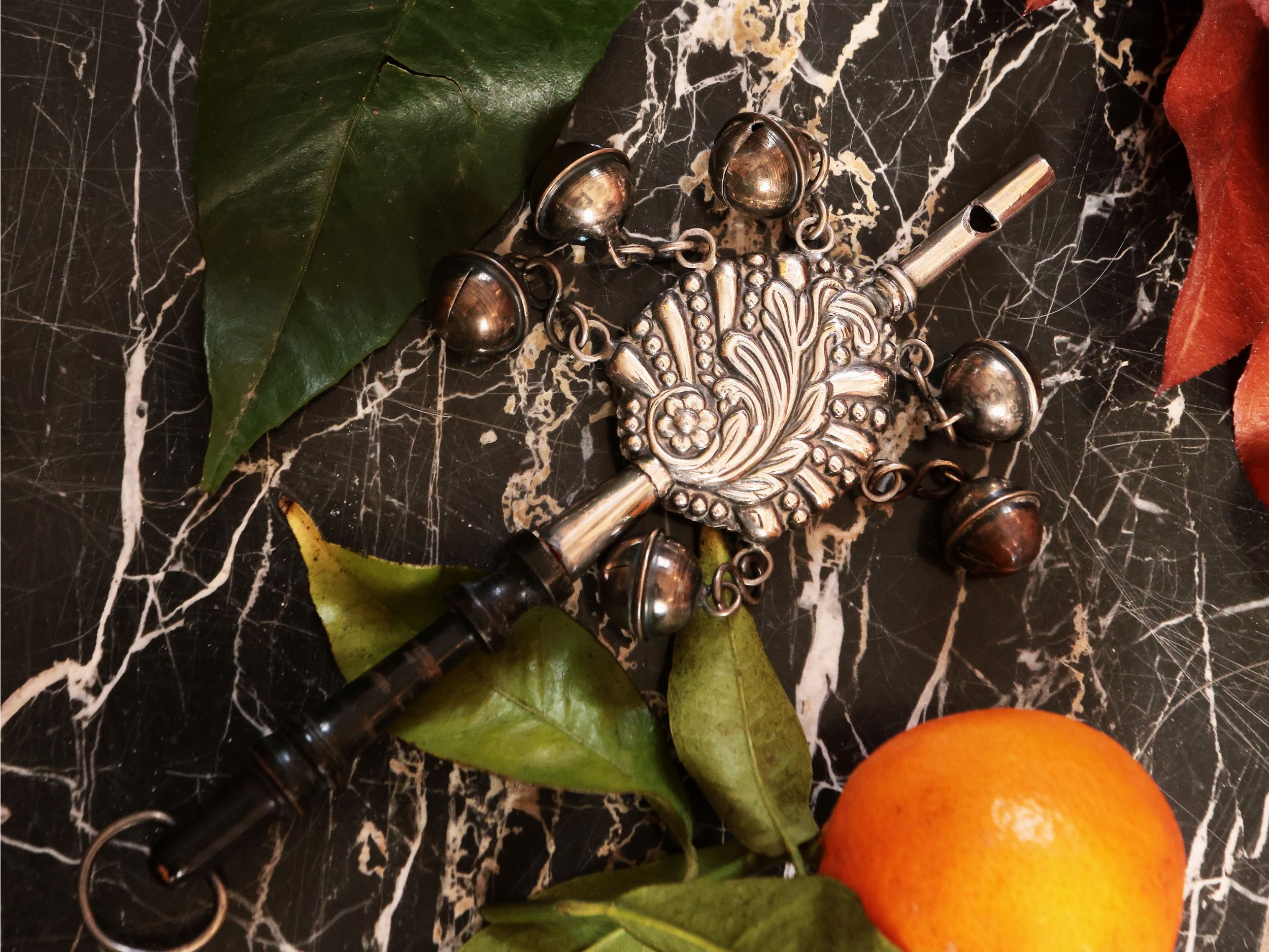 inizio del XX secolo sbalzata con volute, con sei bubboli e fischietto, presa in legno ebanizzato
