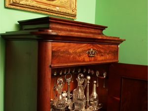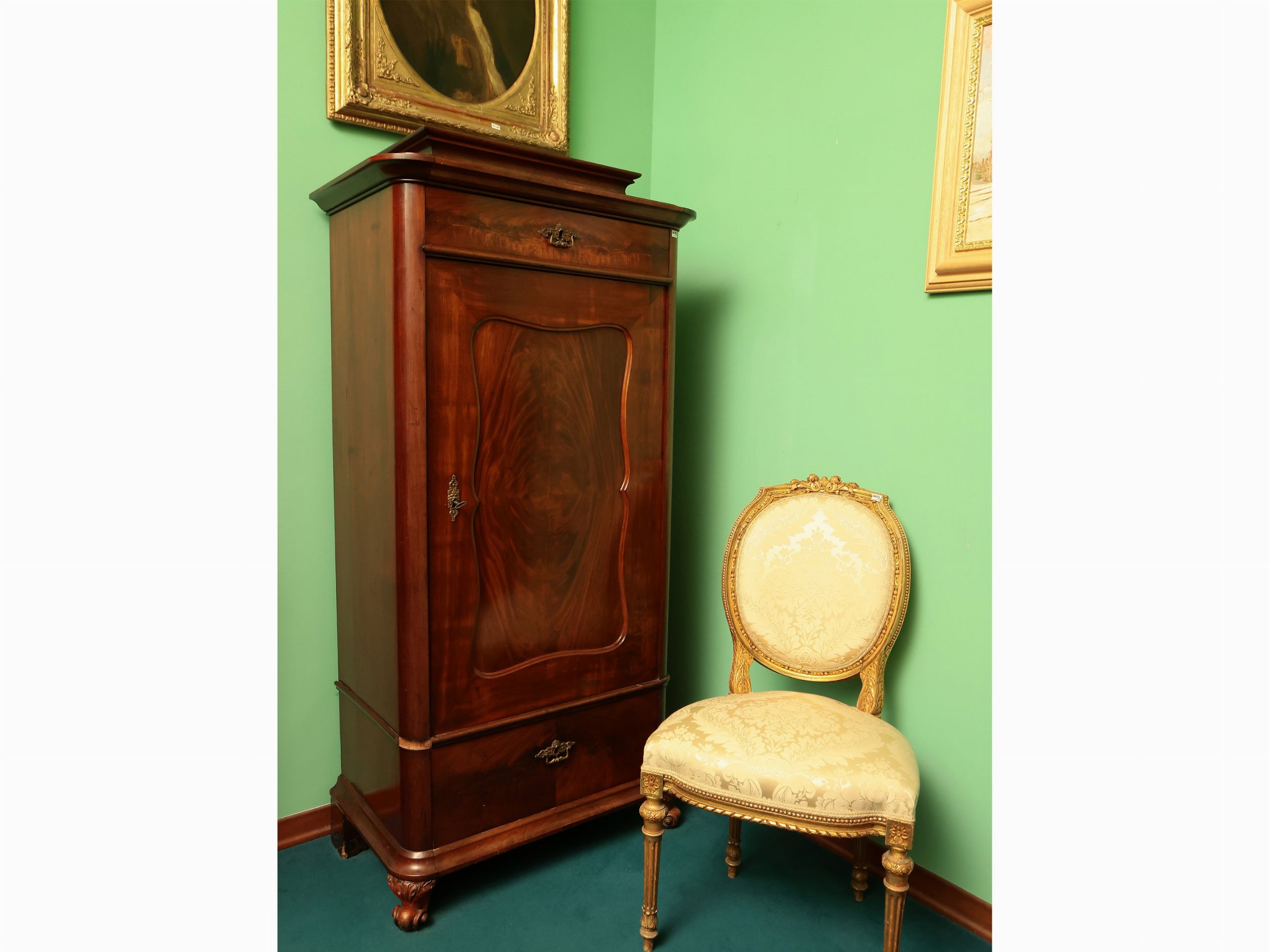 h cm 156x74x47 prima metà del XIX secolo cappello ad urna con cassetto, uno sportello con cornice sagomata sul fronte dritto con cassetto sottostante, piedi ferini, all'interno scaffali e mensolina porta cucchiaini