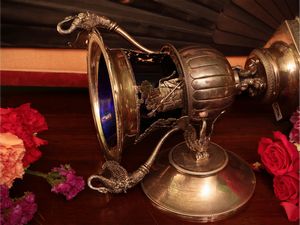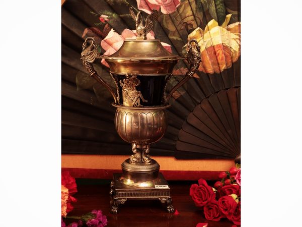 gr 1230, h cm 33 di gusto Impero, corpo con fascia traforata con motivi di baccanale, tralci di vite e grappoli d'uva, prese realizzate come cigni a tutto tondo, motivo che si ripete sul coperchio, base a plinto cesellata con motivo a palmette e con piedini ferini, interno in vetro blu