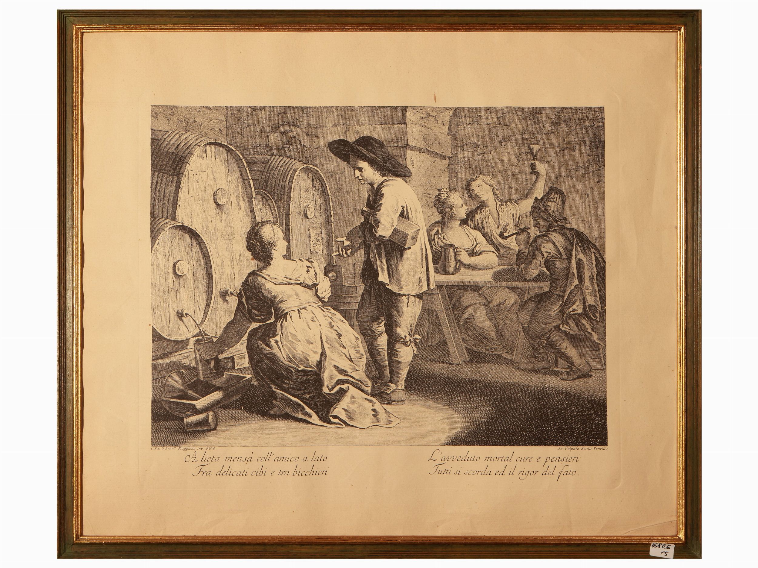 XIX secolo tre incisioni da Giovan Battista Piranesi, abbinate a Scene d'interno, due riproduzioni da incisioni di Volpato, fioriture, in cornice