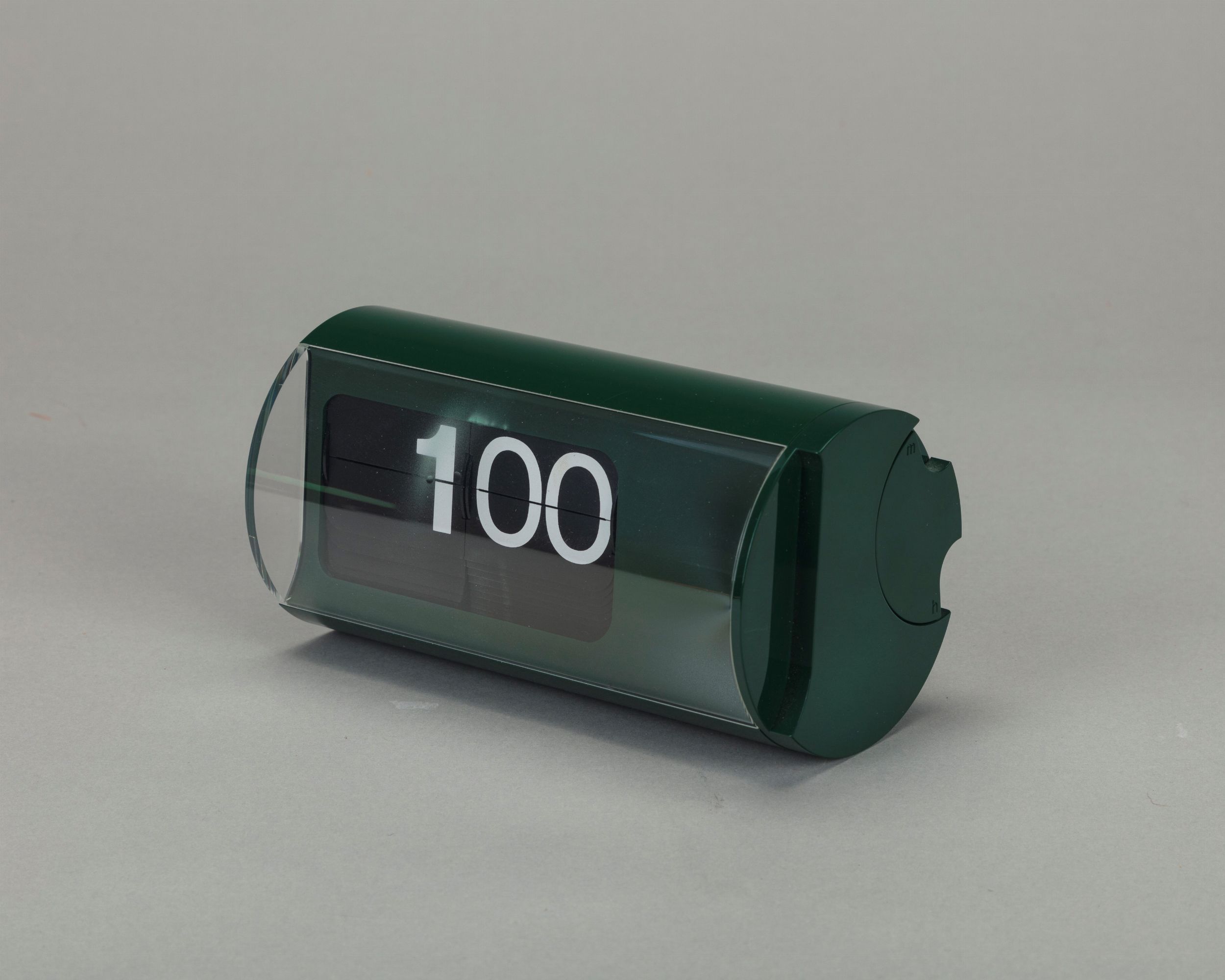 1965 orologio da tavolo, plexiglass, alluminio e plastica verde Prodotto da Solari & C., Udine marchio del produttore stampato sulla base