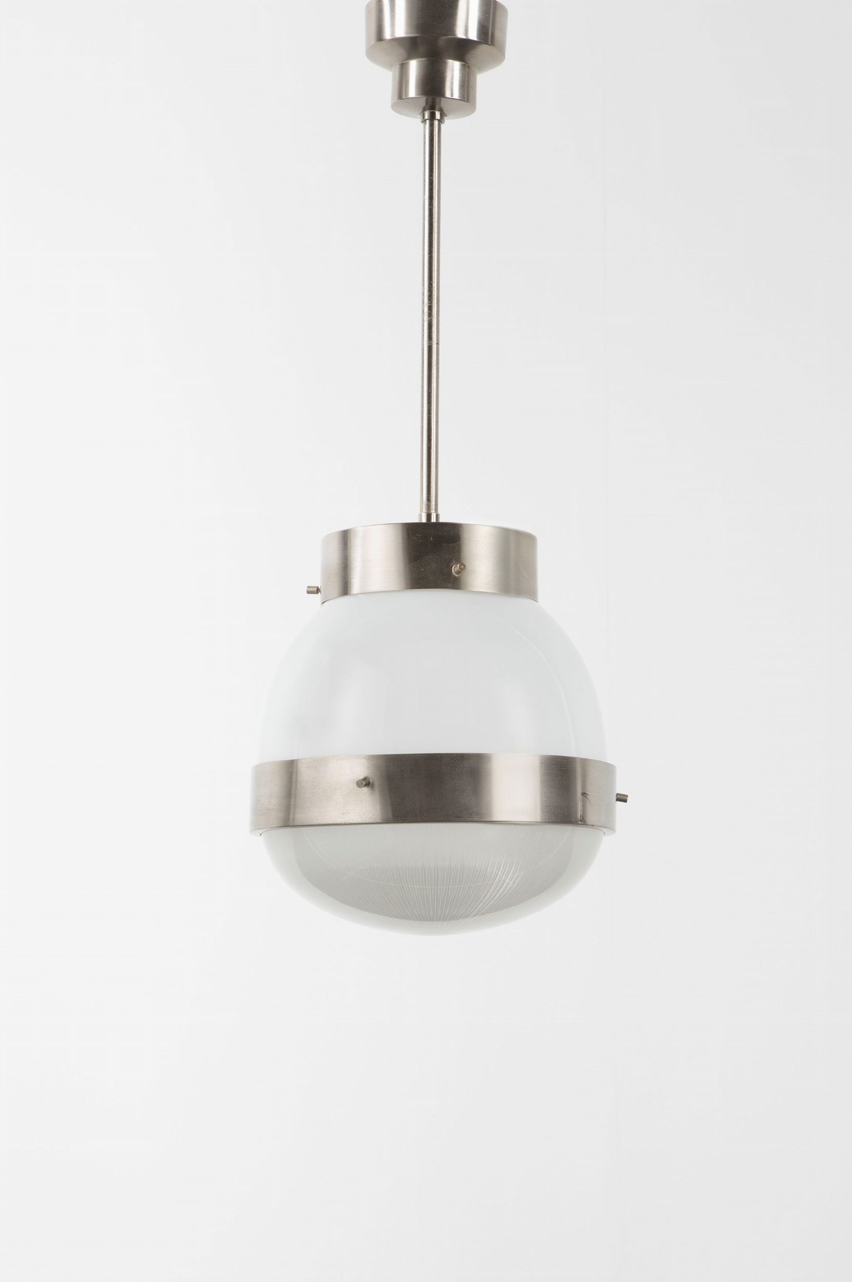 1960 lampada da soffitto in ottone nichelato, diffusore in vetro opalino, coppa in cristallo stampato. Produzione Artemide