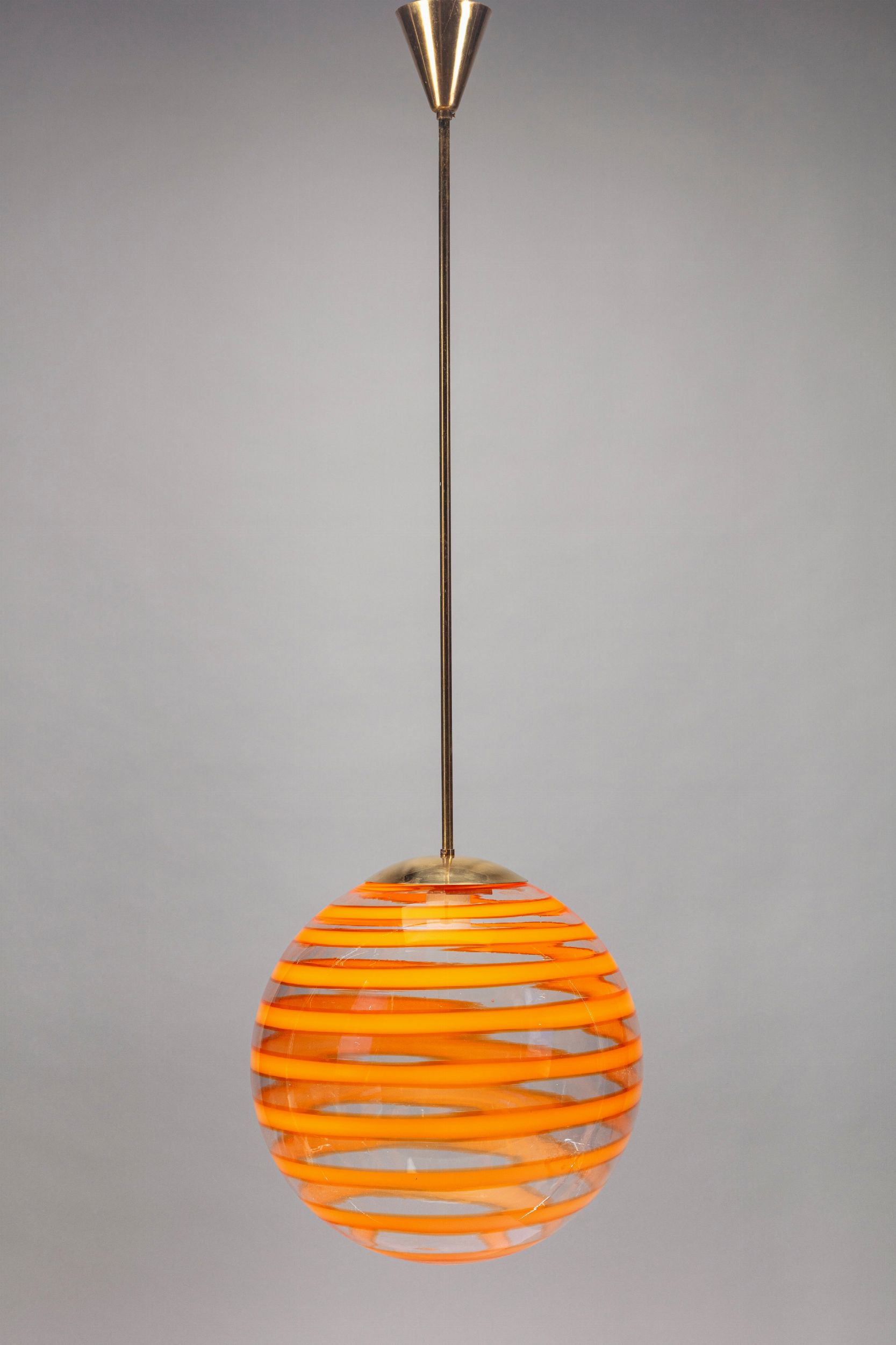 1950 ca. struttura in ottone con grande globo in vetro soffiato e decorato con motivo a spirale arancione Produzione Atelier Carlo Scarpa, Italia
