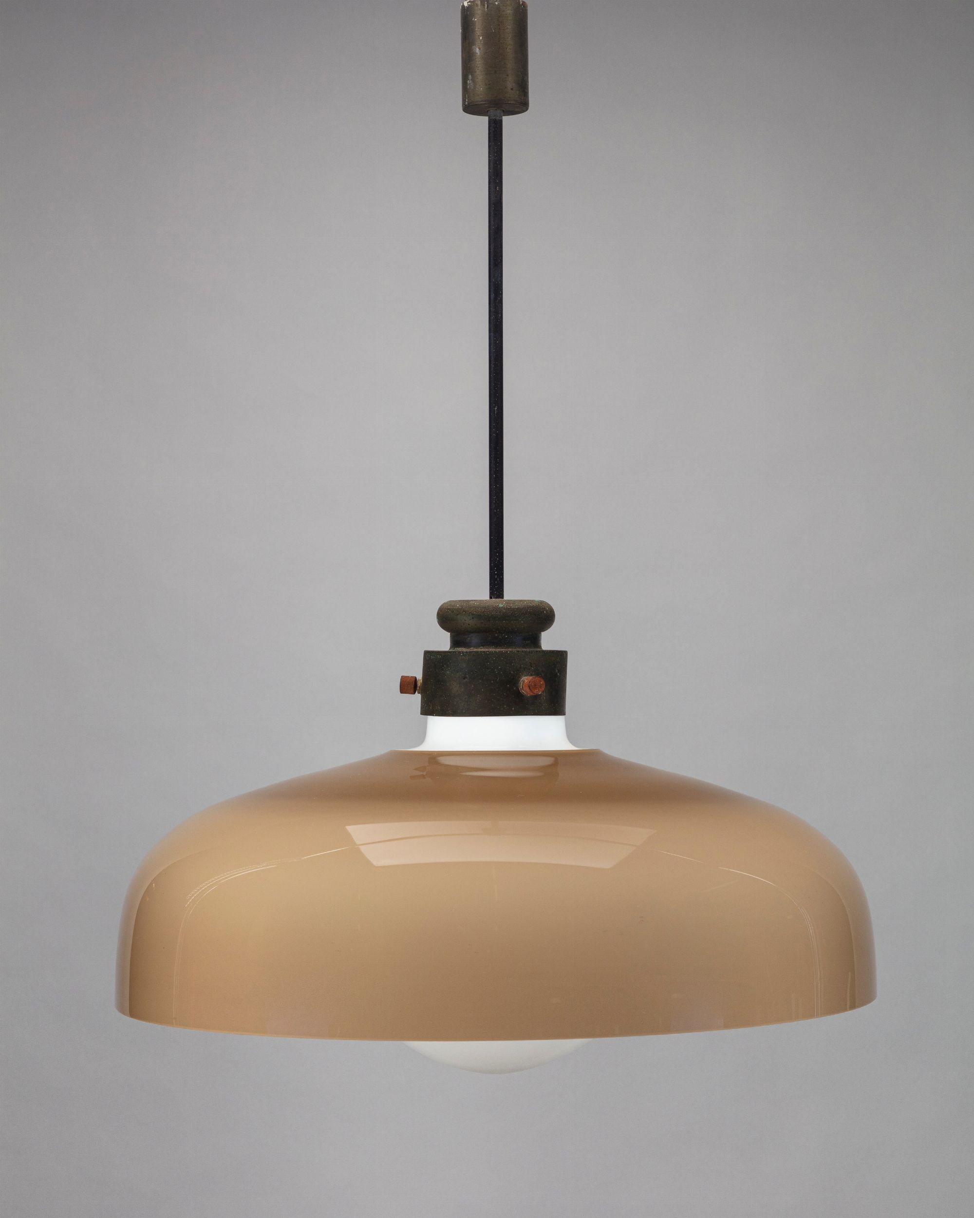 1960 ca. struttura in ottone e diffusore in vetro di Murano soffiato e incamiciato color tortora Produzione Vetreria Vistosi, Italia