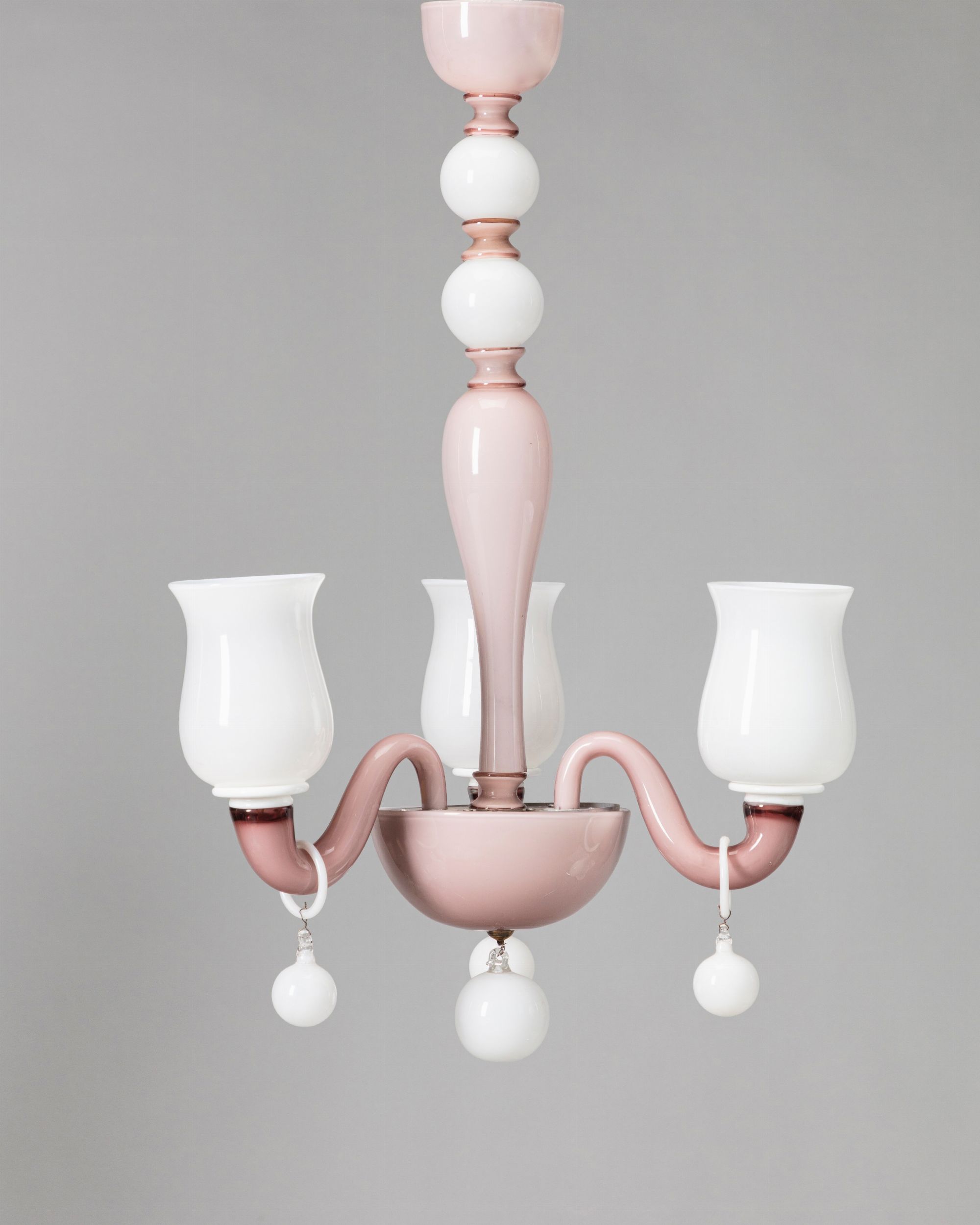 1940 ca. mod. 5523, a tre luci, con struttura in vetro di Murano a più strati, vetro lattimo e metallo Produzione Venini, Italia
