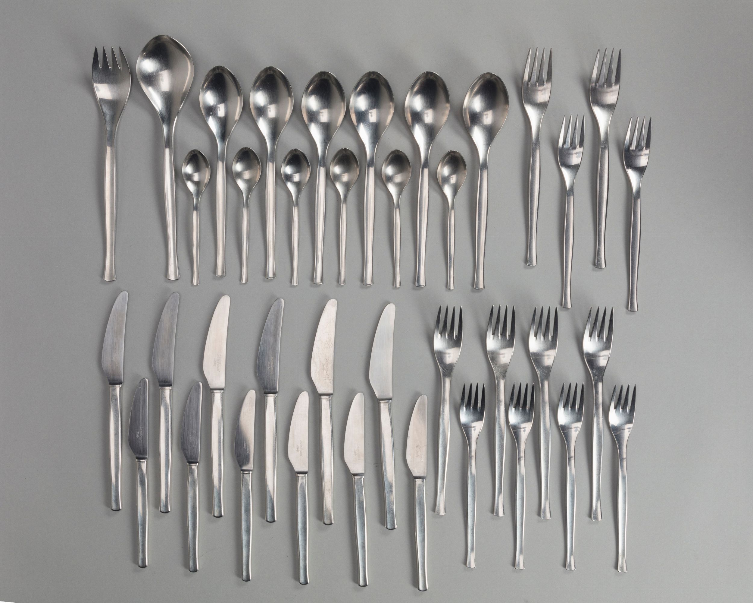 1960 ca. composto da sei coltelli da portata, sei coltelli da frutta, sei cucchiai, sei cucchiaini, sei forchette e sei forchettine, in metallo marchio inciso sul metallo