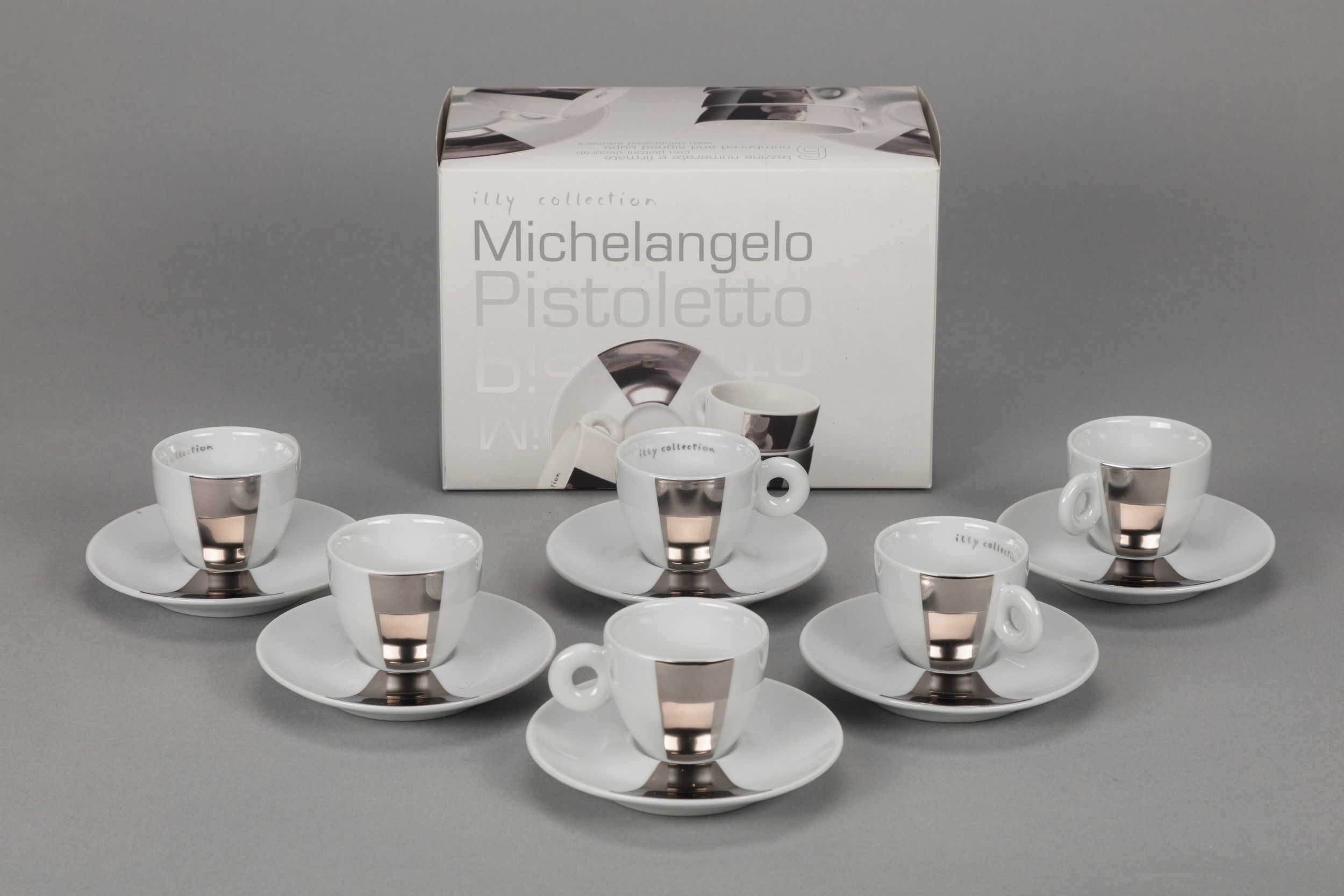 2002 composto da sei tazzine e sei piattini in porcellana dipinta, confezione originale Produzione Illy Collection - Artists cups marchio sotto la base