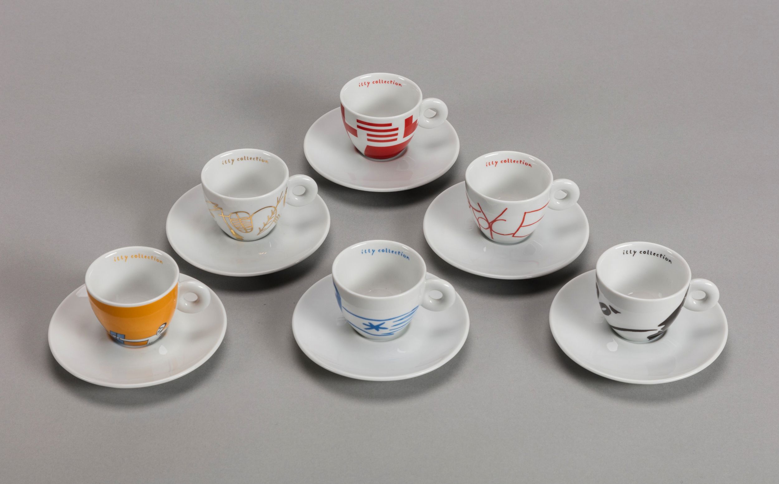 1990 ca. composto da sei tazzine e sei piattini, in porcellana smaltata e decorata Produzione Rosenthal per Illy Collection marchio della produzione sotto la base