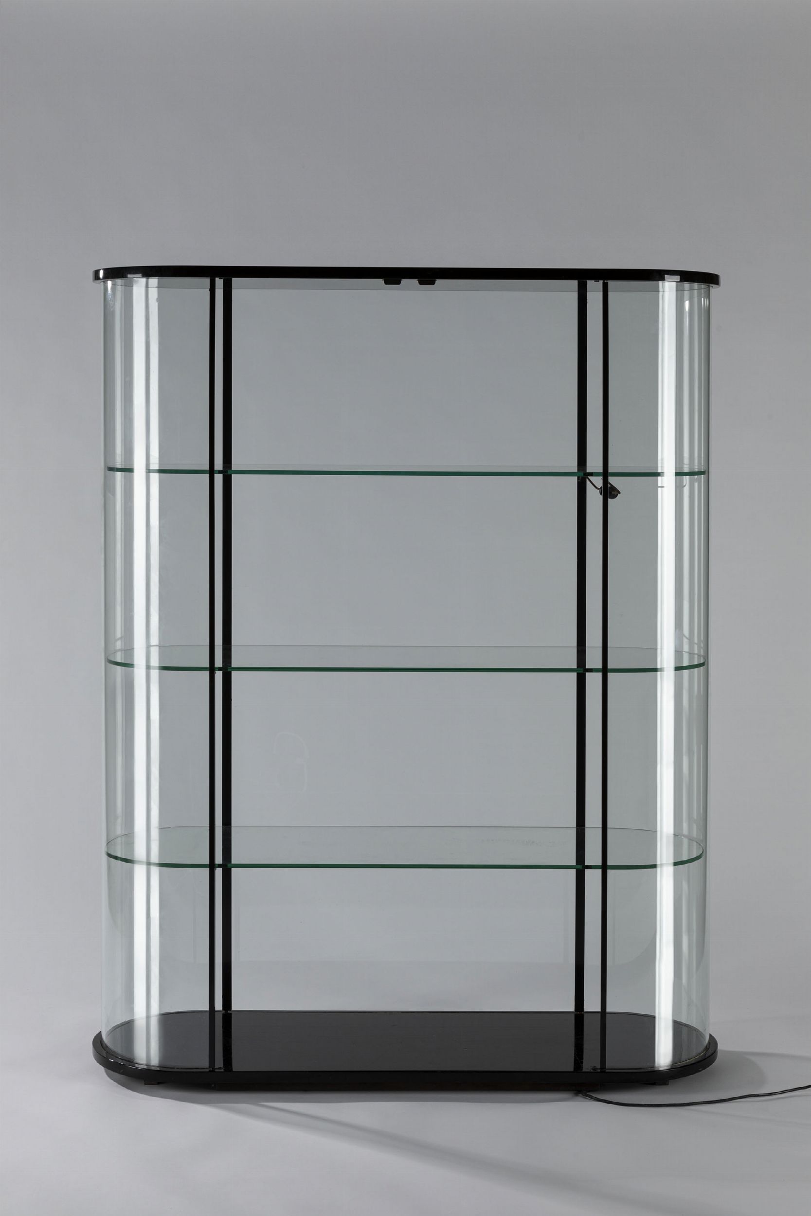 1980 ca. in vetro curvato con tre ripiani in vetro, top e base in legno di frassino verniciato nero. Dotata di Kit di illuminazione composto da: 2 lampade led ad alta luminositŕ. Prod. Veblén By Fiam Italia Mancanze