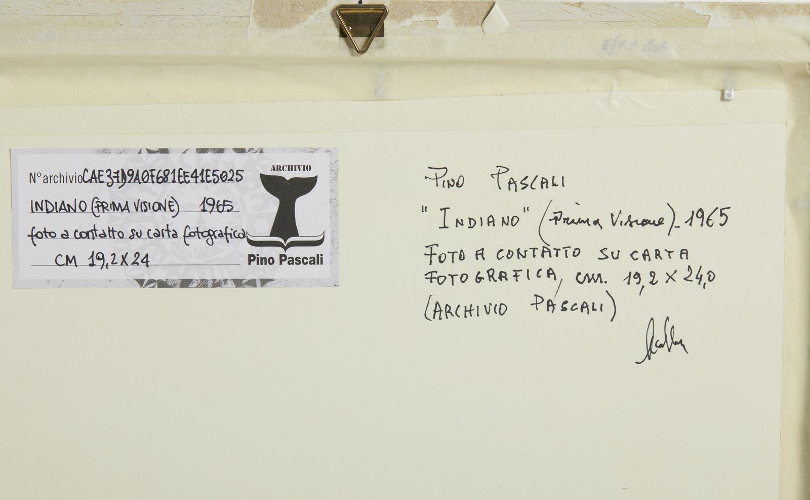 sul retro: certificato di autenticità a cura di Carla Maria Ruta Lodolo ed etichetta Archivio Pino Pascali, Firenze L'opera è accompagnata da certificato di archiviazione a cura dell'Archivio Pino Pascali, Firenze