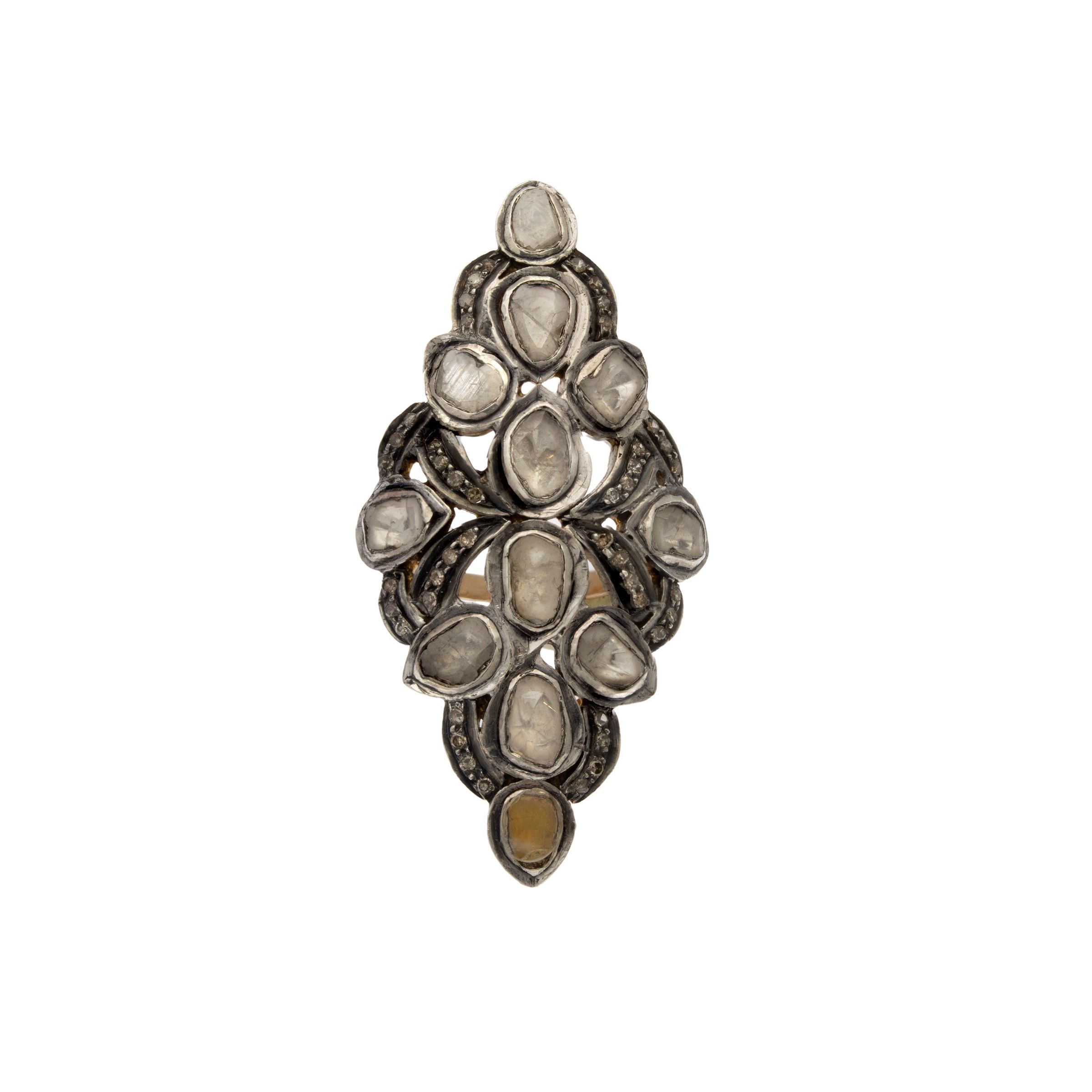 Antico anello a losanga in oro e argento con diamanti piatti