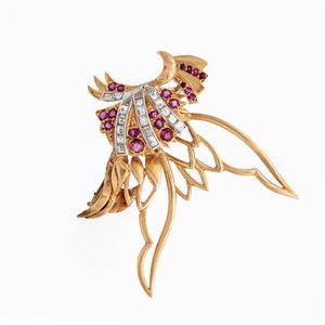 Spilla oro giallo e bianco 14kt con diamanti e rubini