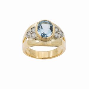 peso 12 gr. acquamarina taglio ovale ct 2,50 circa, diamanti taglio brillante ct 0,30 circa, misura 16