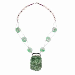 Collana in oro bianco 18kt centrata da giada naturale scolpita ed incisa