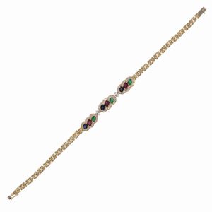 peso 9,5 gr. taglio brillante ct 0,40 circa, rubini, zaffiri e smeraldi ct 3,50 circa, lunghezza 17,5 cm.