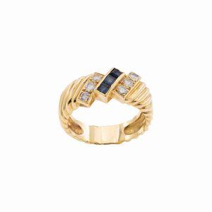 Anello in oro giallo 18kt zaffiri carré e diamanti