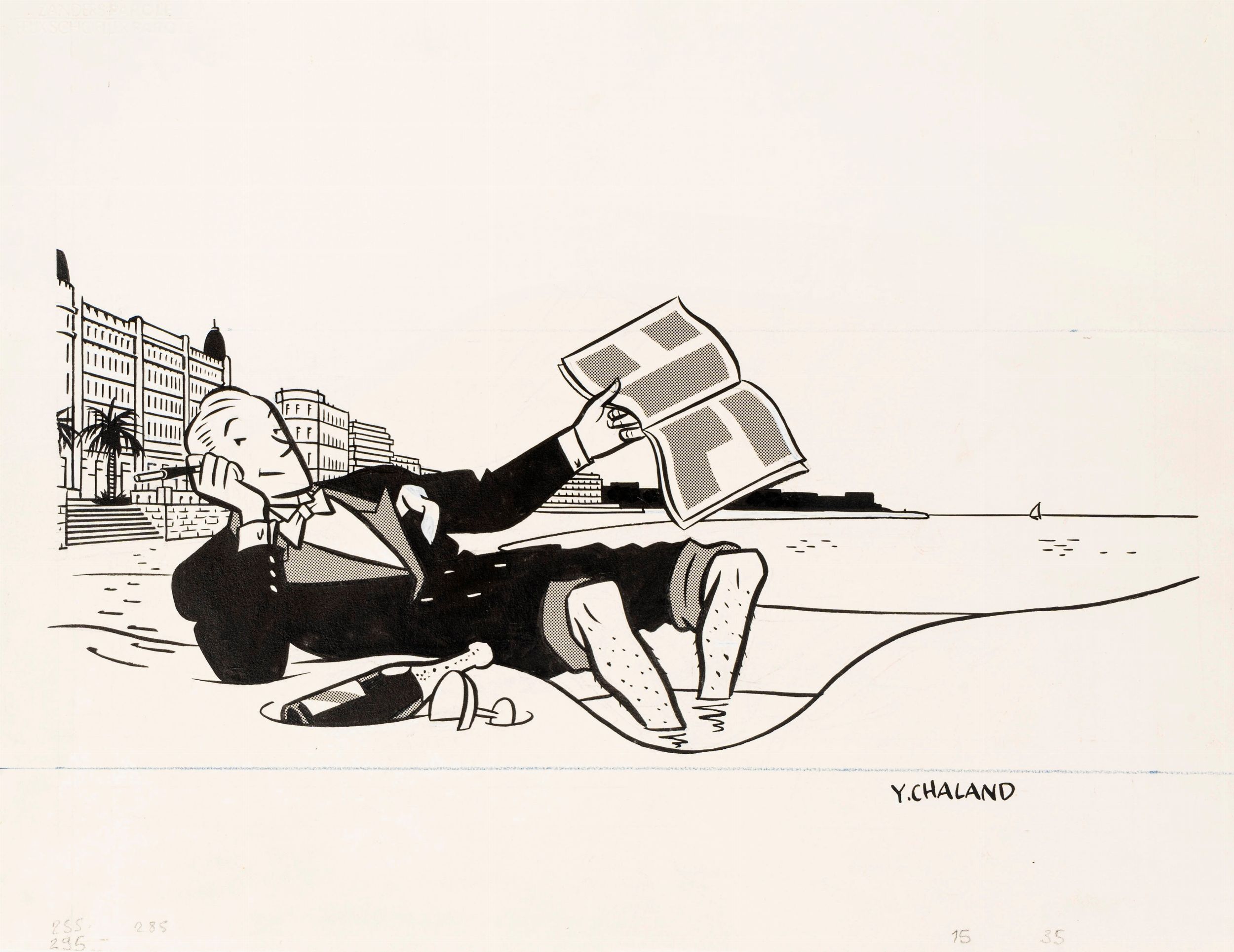 matita, china e retino su cartoncino, 32,5 x 25 cm anni 80 Illustrazione originale realizzata da Chaland per la serie di cartoline postali intitolata 'Bonnes Vacances', edita in Francia dalle Editions G.G.E.F. (Groupement Graphique d'Expression Française) e dalle Editions d'Art YVON durante gli anni '80. Firmata.