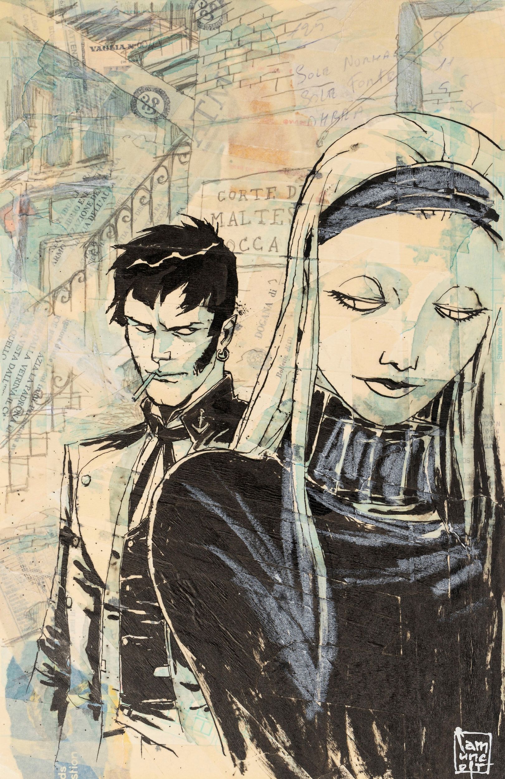 tecnica mista su cartoncino, 28 x 43 cm 2007 Illustrazione originale realizzata da Camuncoli come omaggio al Corto Maltese di Hugo Pratt. Opera pubblicata sul quotidiano francese Le Figaro del 25 Gennaio 2007 nella sezione dedicata alla fiera di Angouléme 2007. Firmata.