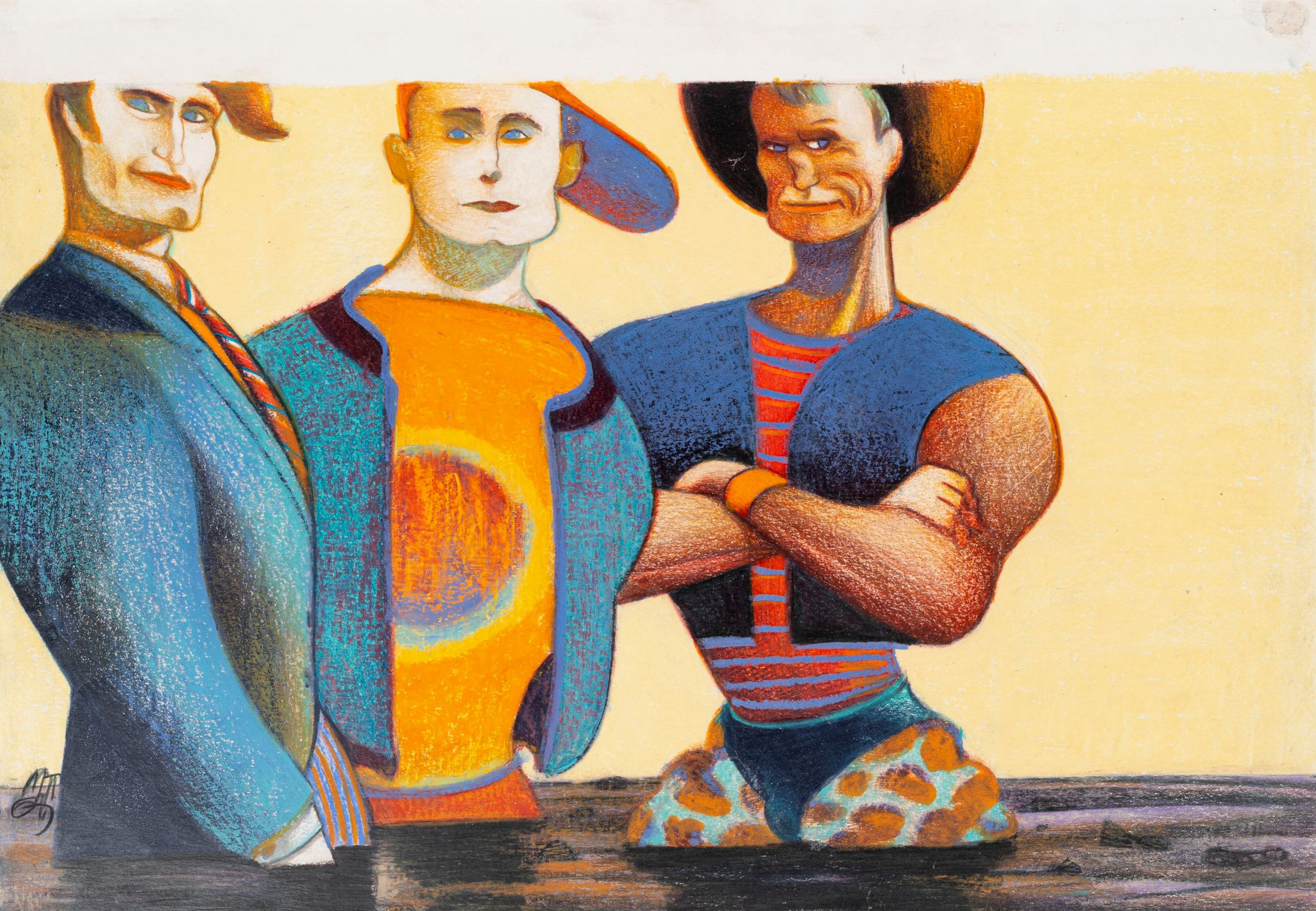 pastelli a cera su cartoncino, 48 x 33 cm anni 80 Illustrazione originale realizzata da Mattotti alla fine degli anni '80 durante la sua collaborazione con il celebre magazine Vanity Fair. Il mondo della moda ha pervaso profondamente tutto il lavoro di Mattotti tra gli anni '80 e '90, divenendo protagonista per definire la personalità e gli atteggiamenti dei suoi personaggi anche grazie ai capi che indossano. Firmata.