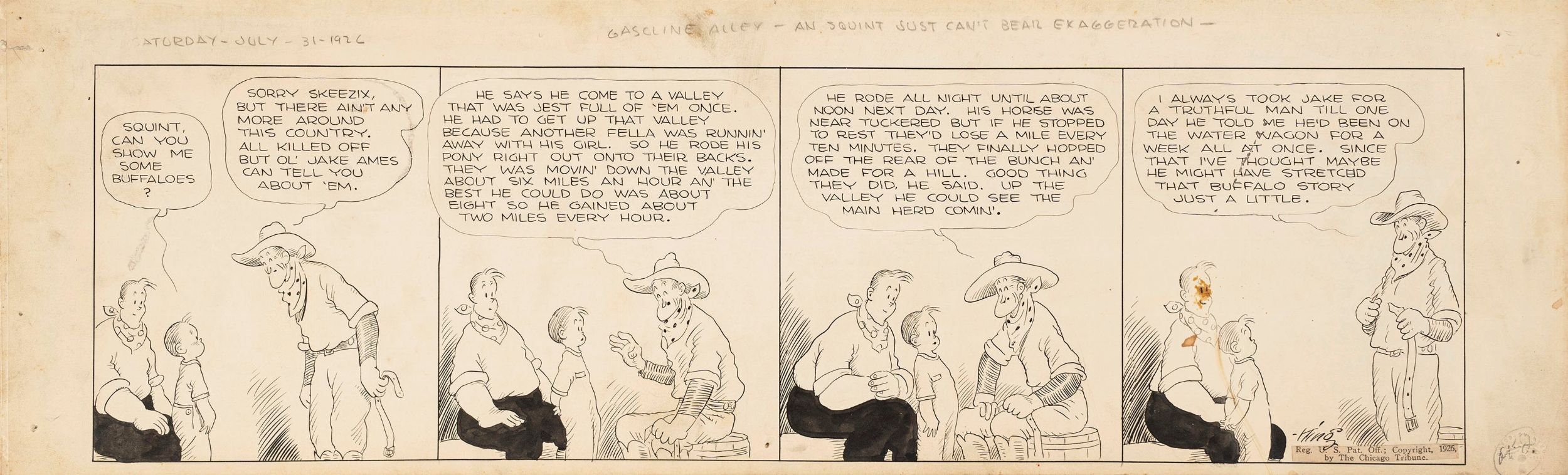 matita e china su cartoncino, 58,5 x 18,5 cm 1926 Striscia giornaliera del 31/07/1926 per Gasoline Alley intitolata 'An Squint just can't bear exaggeration'. Creata da Frank King nel 1918 è una delle più longeve e creative strisce a fumetti americane. King racconta la storia di Walt Wallet e del suo figlio adottivo Skeezix attraverso le generazioni. King infatti introdusse il concetto dell'invecchiamento dei suoi personaggi, facendoli crescere mano a mano che il fumetto progrediva negli anni. Fori di affissione ai margini, piccolo strappo al margine sinistro. Firmata e datata.