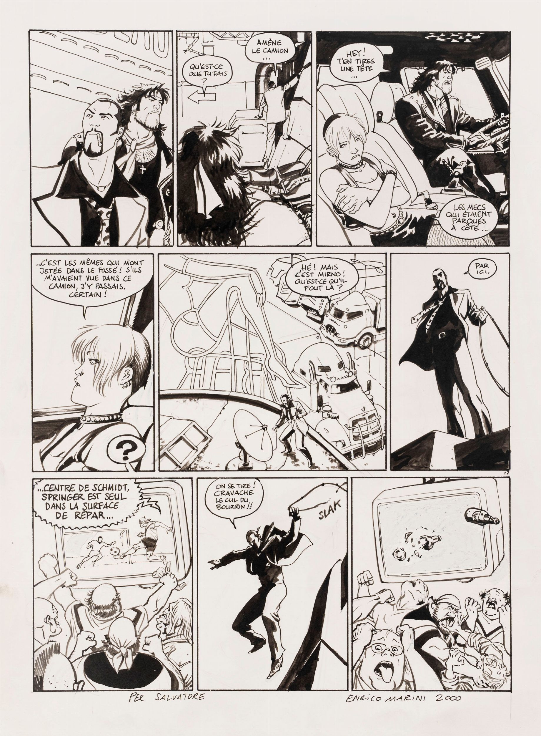 matita e china su cartoncino, 31 x 42 cm anni 90 Tavola originale realizzata da Marini per la serie 'Gipsy', edita per la prima volta in Francia da Dargaud nel 1992. Una delle prime saghe a fumetti a far scoprire il talento di Enrico Marini. Gipsy narra l'odissea di un gitano in un mondo futuristico devastato dalle guerre e dai mutamenti climatici. Firmata, datata e dedicata.