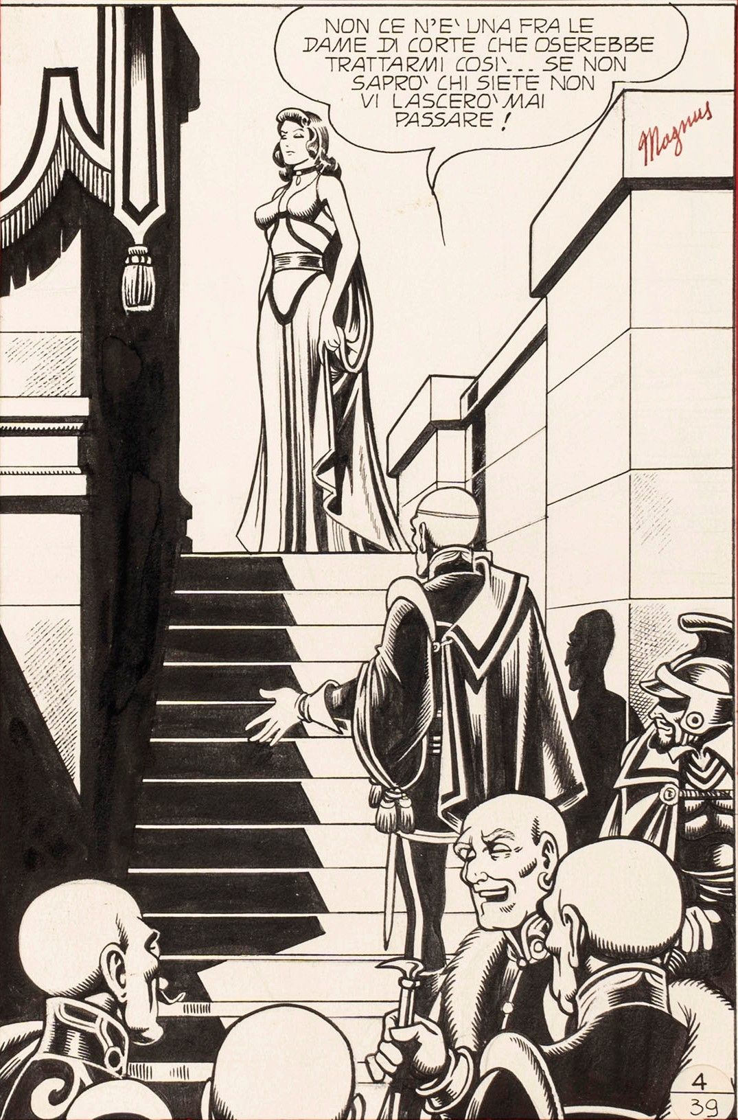 matita e china su cartoncino, 15 x 23 cm 1978 Vignetta originale realizzata da Magnus per 'Ombre del palazzo' contenuta nell‘Atto I de I Briganti a pag. 41 e pubblicata per la prima volta dalla Edifumetto nel 1978. Opera racchiusa nel folder originale realizzato da Alessandro Editore come certificato d‘autenticità nel 2002. Firmata.