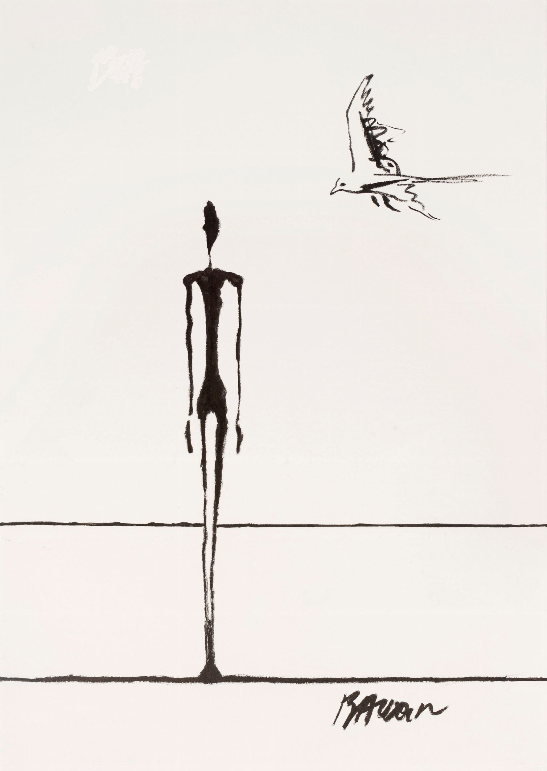 china su cartoncino, 29,5 x 42 cm anni 2000 Disegno originale realizzato dall'autore francese Baudoin, vincitore del premio Alph’Art per la migliore sceneggiatura ad Angouleme nel gennaio 1997. Baudoin si interroga regolarmente sul rapporto tra un artista e la sua opera ed è un narratore intimo e fortemente autobiografico. Firmato.