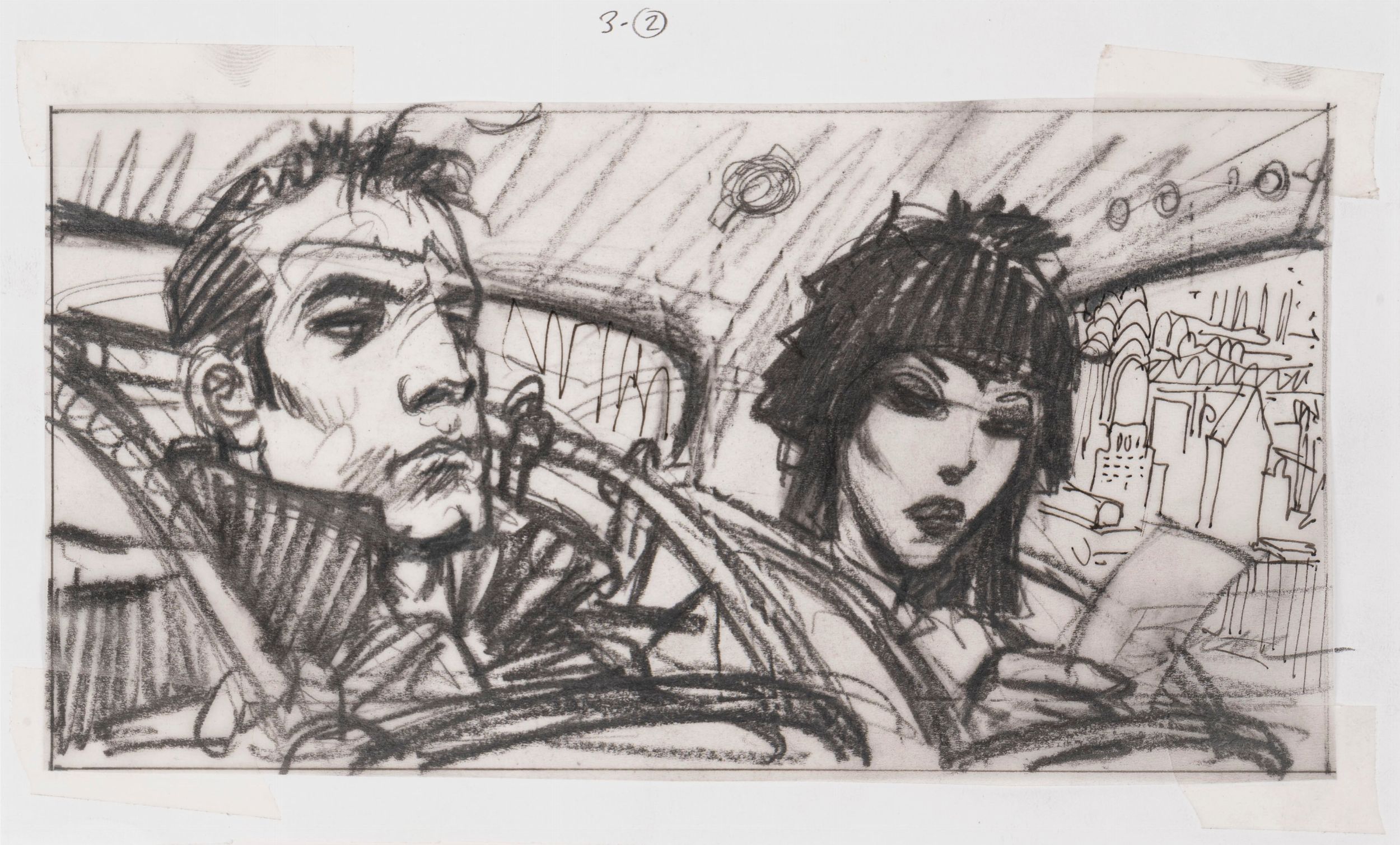 matita e china su lucido applicato su carta, 19 x 10 cm 1998 Disegno preliminare realizzato da Bilal, una vignetta del suo capolavoro 'Le sommeil du monstre', edito da Les Humanoides Associés nel 1998. La serie segue le avventure di John DiFool, un detective privato che vive in un futuro distopico, coinvolto in una ricerca per ritrovare un artefatto chiamato 'Il Mostro'. Adesivo trasparente agli angoli.