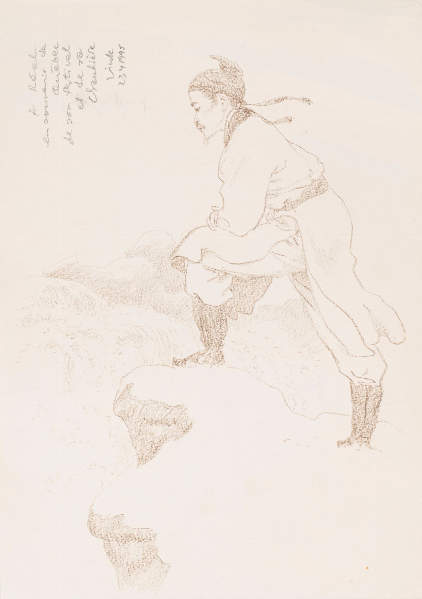 1995 Disegno originale realizzato dall'autore vietnamita Vink, raffigurante il protagonista della celebre serie 'Le moine fou' edita per la prima volta in Francia da Dargaud nel 1984. Firmato e datato.
