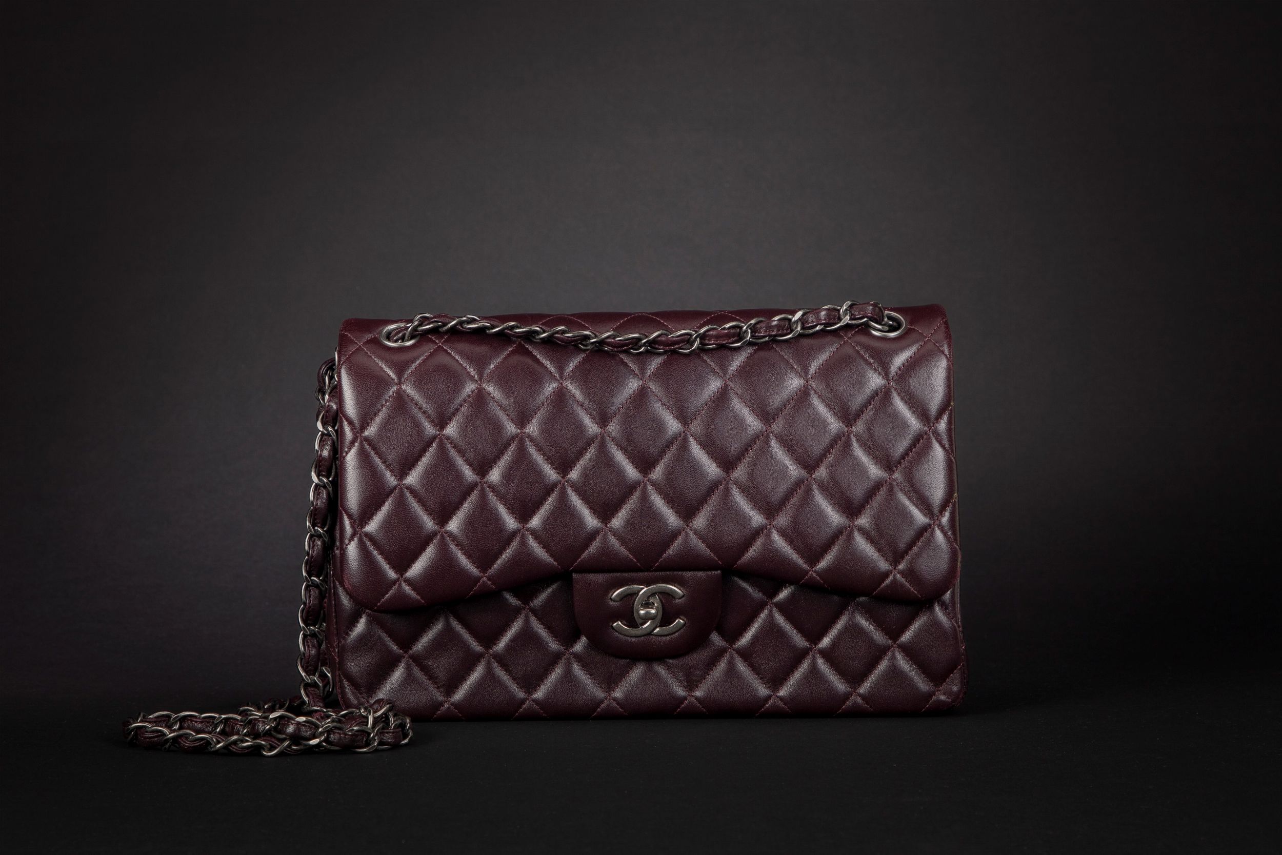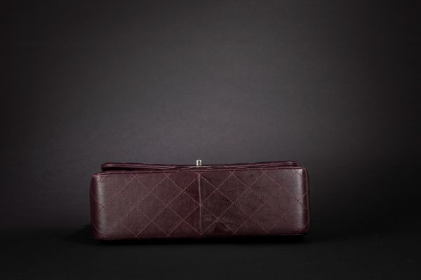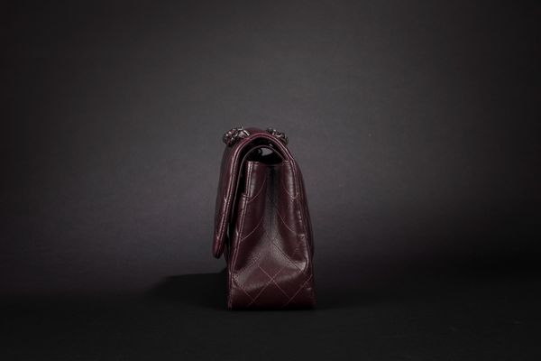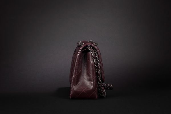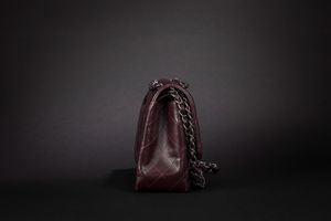 2014 in pelle matelassé color melanzana, con tracolla a catena, dettagli in metallo brunito, cm 30, con sacchetto