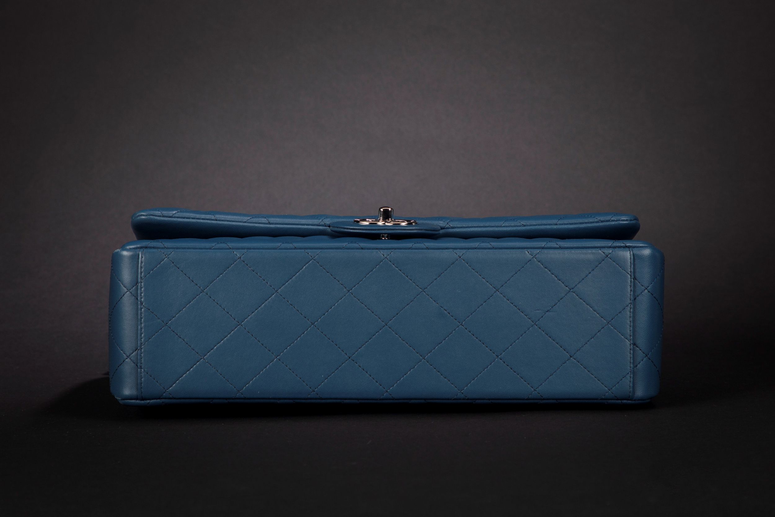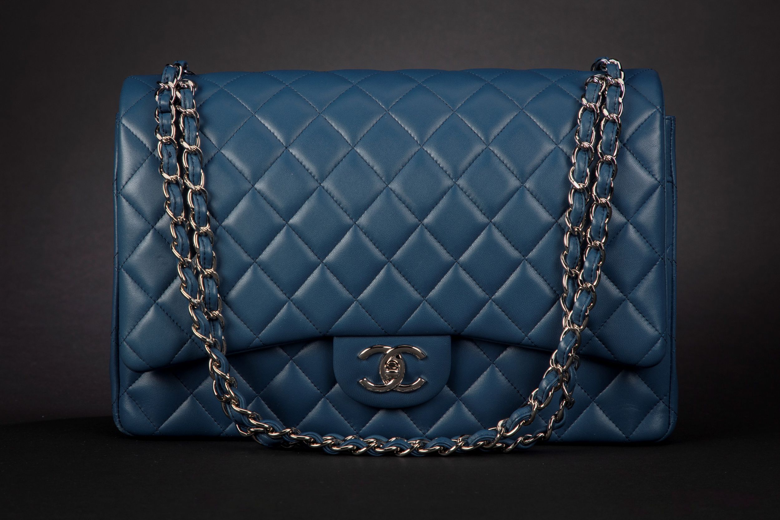 2017 in pelle matelassé color blu, tracolla a catena in metallo, cm 33, con sacchetto