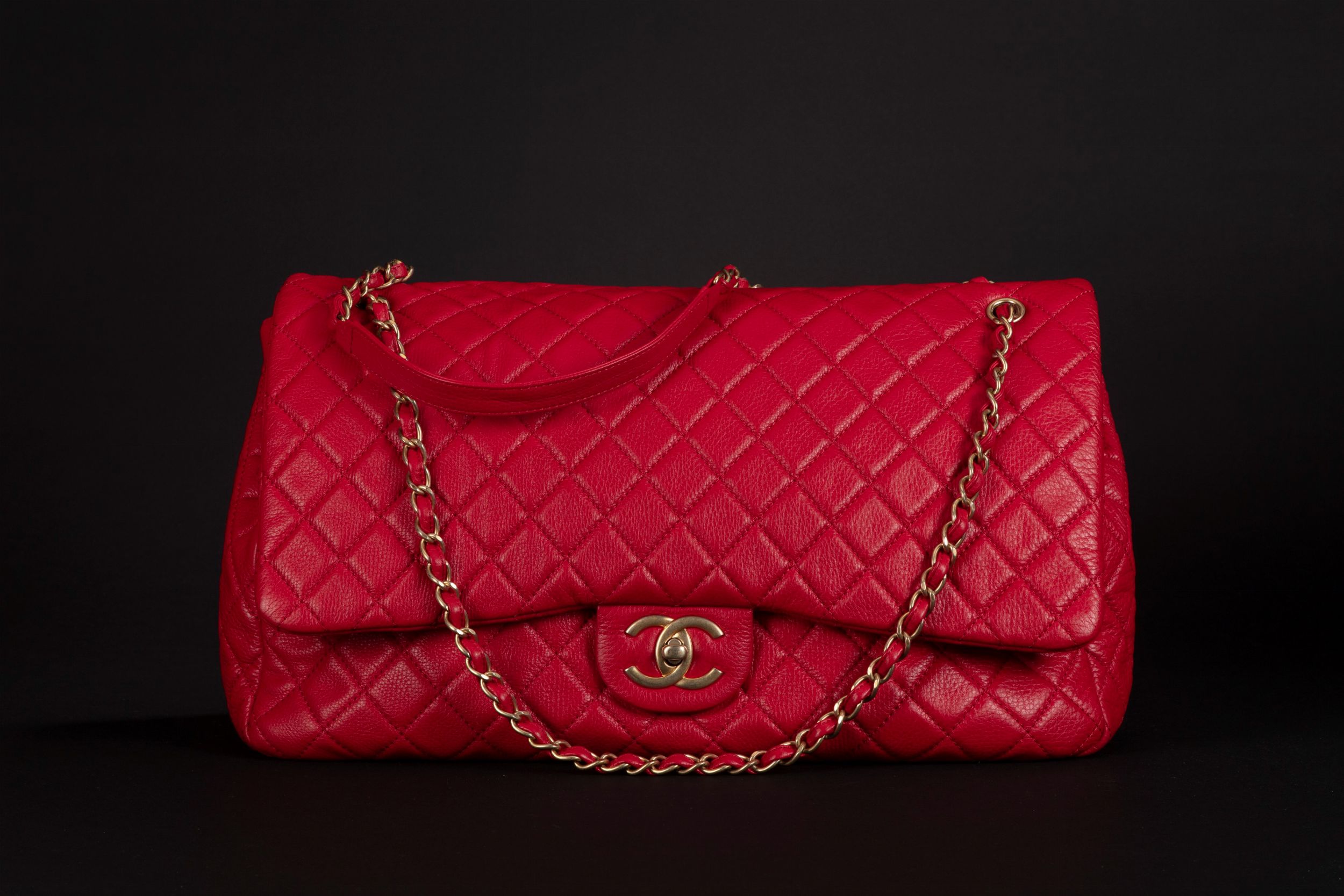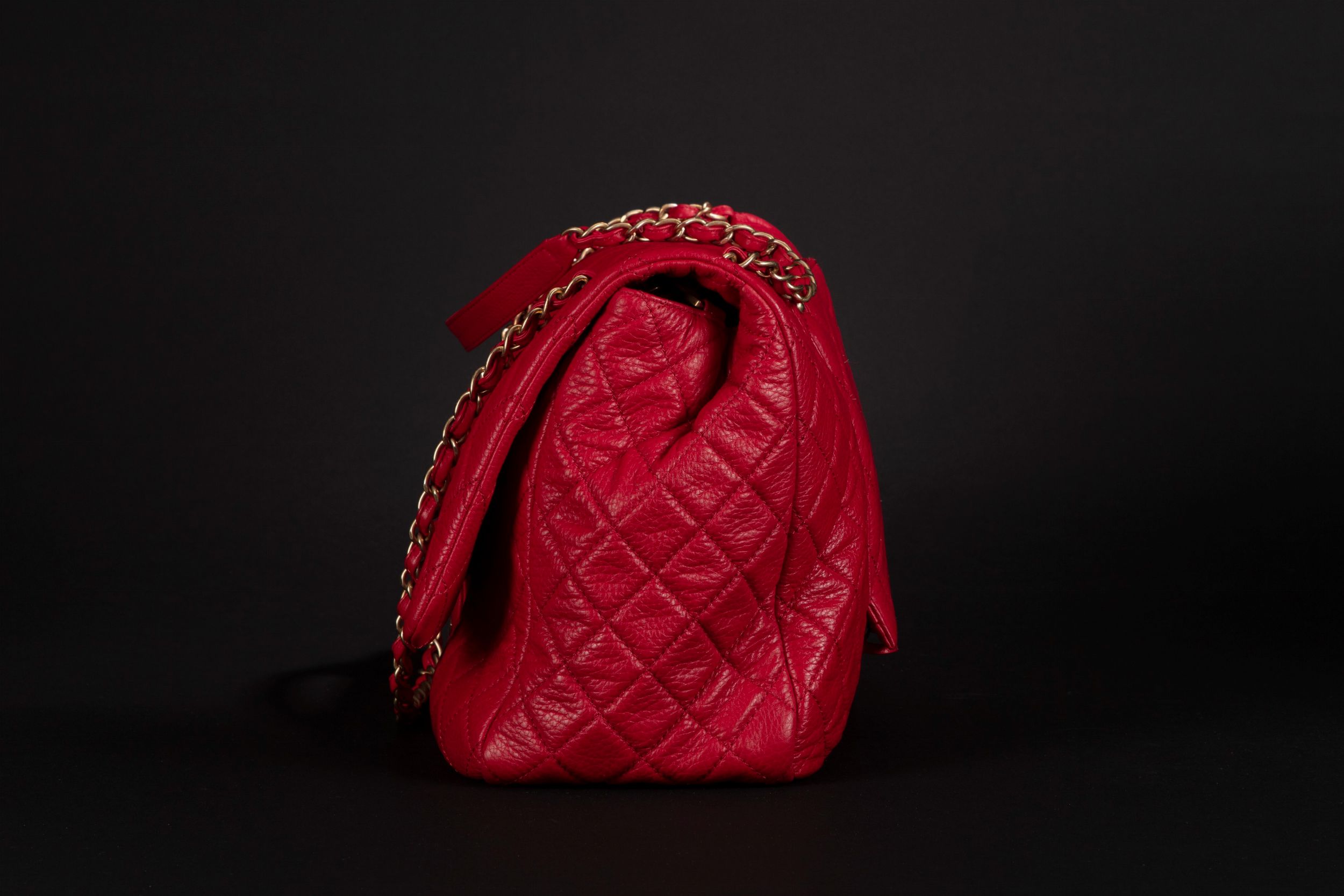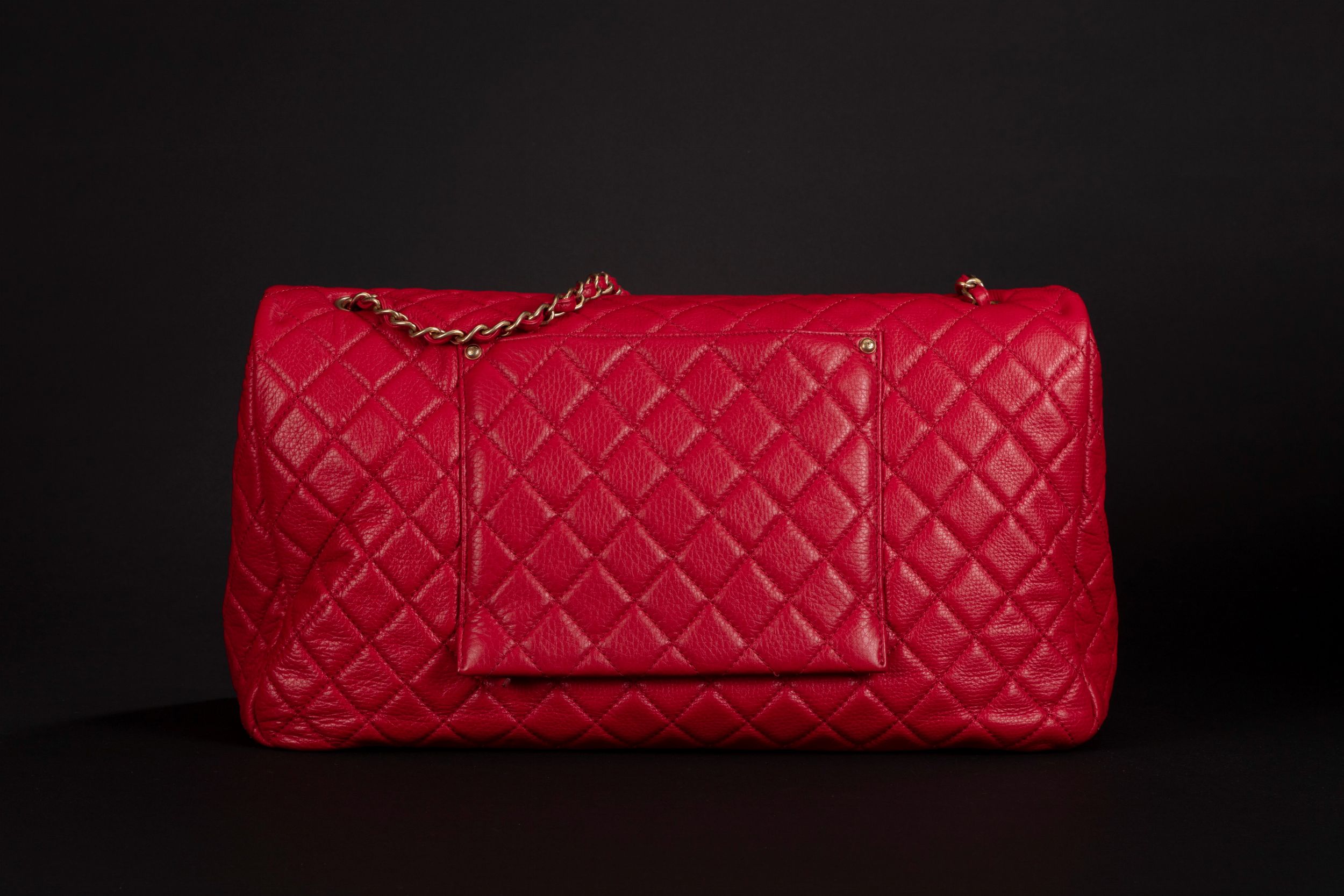 2018 in pelle matelassé color rosso, tracolla a catena in metallo dorato, cm 43, con sacchetto (apertura per trolley sul retro)