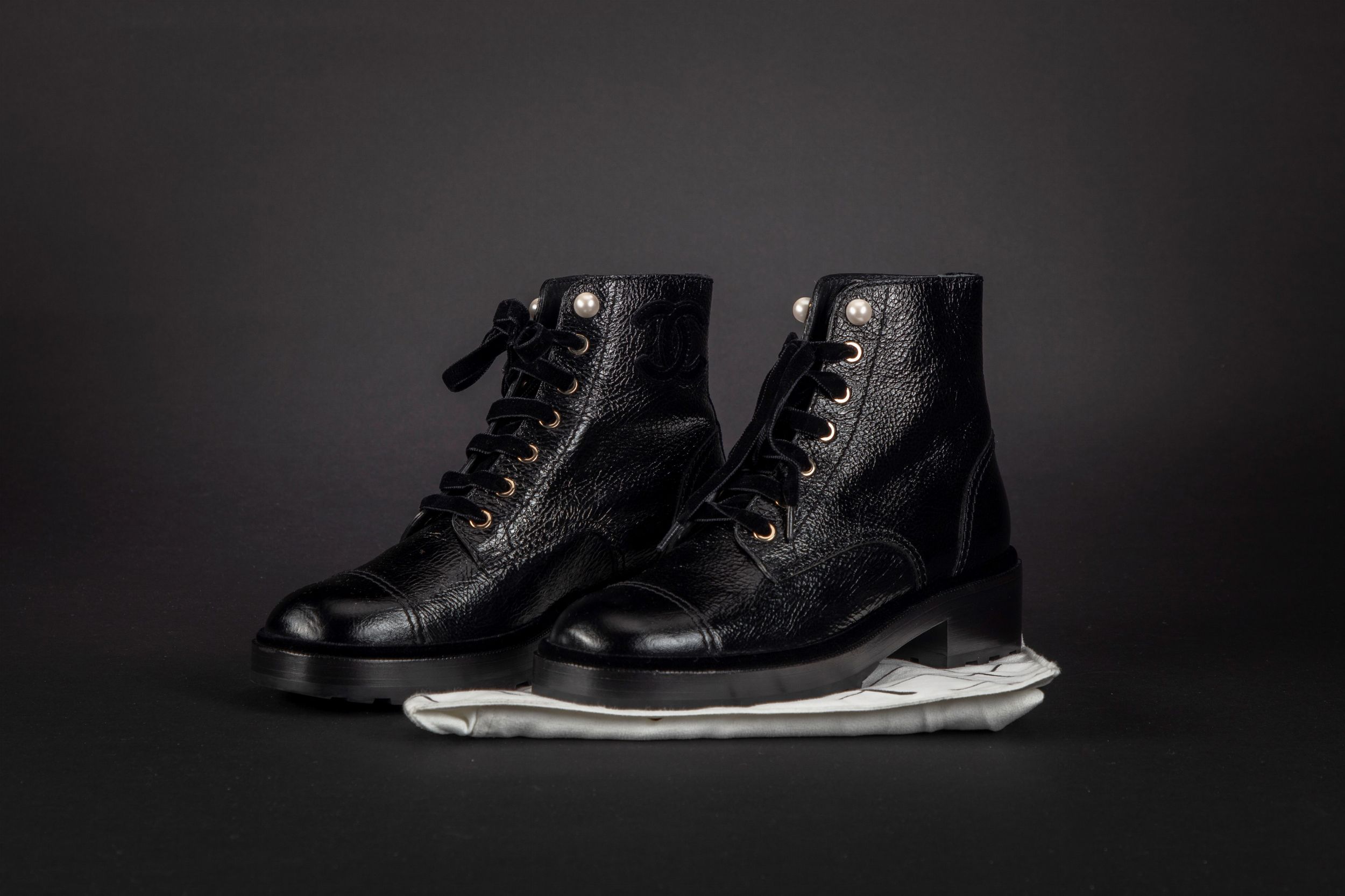 in vernice e pelle color nero, dettagli in metallo dorato e perle fancy, stringhe e applicazioni in velluto color nero, misura 39 1/2, con sacchetti (nuovi e mai usati)