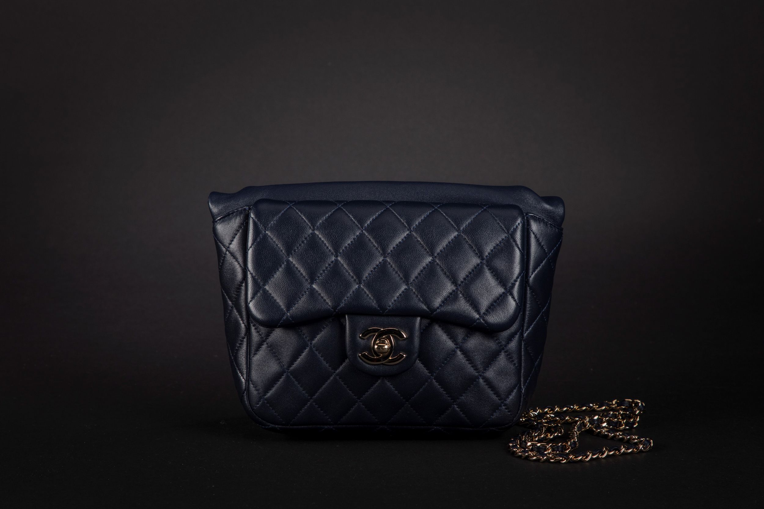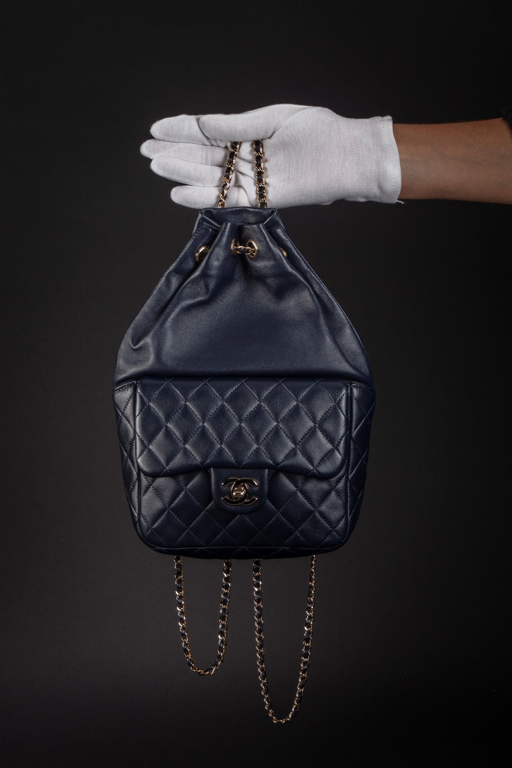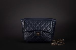 In pelle color blu, matelassé, dettagli a catena in metallo dorato, con sacchetto, 2015