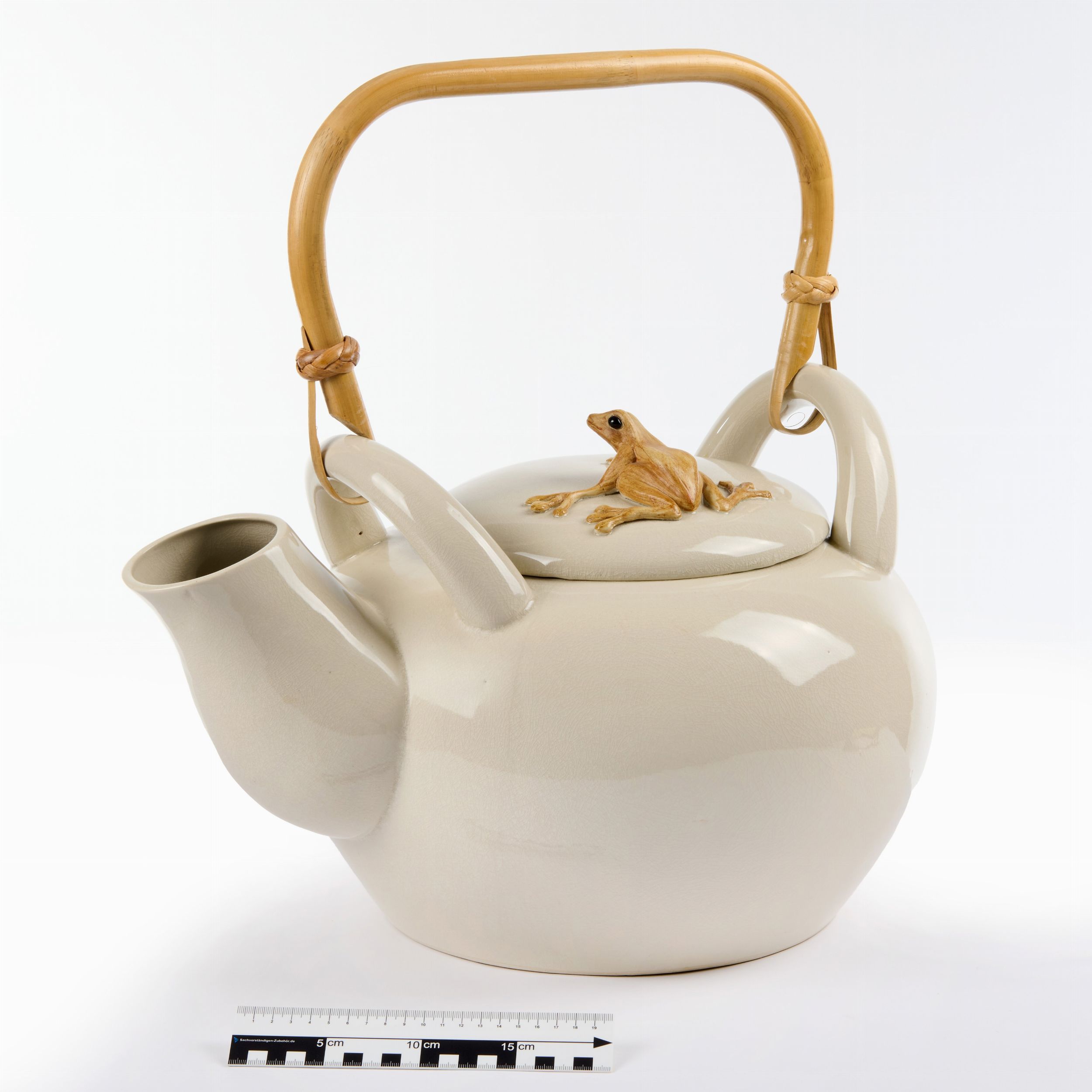 Grande teiera in ceramica bianca con presa del coperchio a rana e manico in bamb [..]