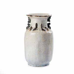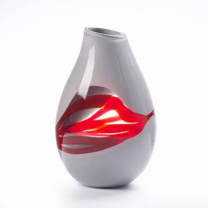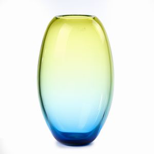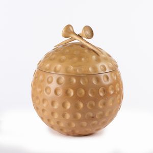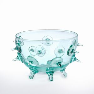 Vetro, cm 37x30,5x21,5 Vetro verde con applicazioni di foglia d'oro e motivo a semisfere in rilievo a stampo. [..]