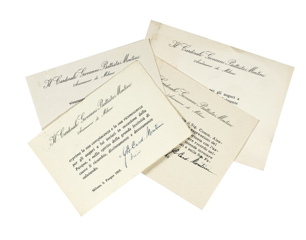 Manoscritti a inchiostro blu. Biglietti a stampa con firma autografe su carte intestate Il Cardinale Giovanni Battista Montini / Arcivescovo di Milano. Dimensioni varie.