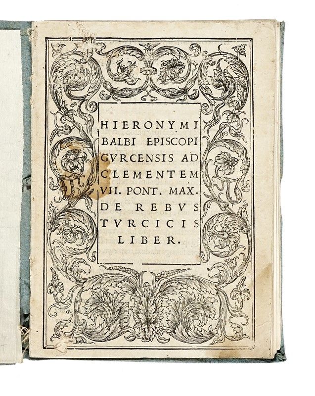 In-4° (mm 187x137). Carte: [42]. Frontespizio entro ricca cornice floreale xilografica. Piccolo alone scuro all'angolo esterno inferiore, una macchietta e un forellino al frontespizio e successive 4 carte, fascicoli sciolti quasi sciolti preservati entro foglio di carta azzurra posteriore.