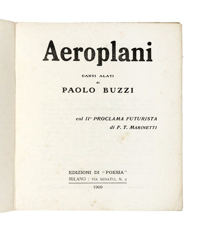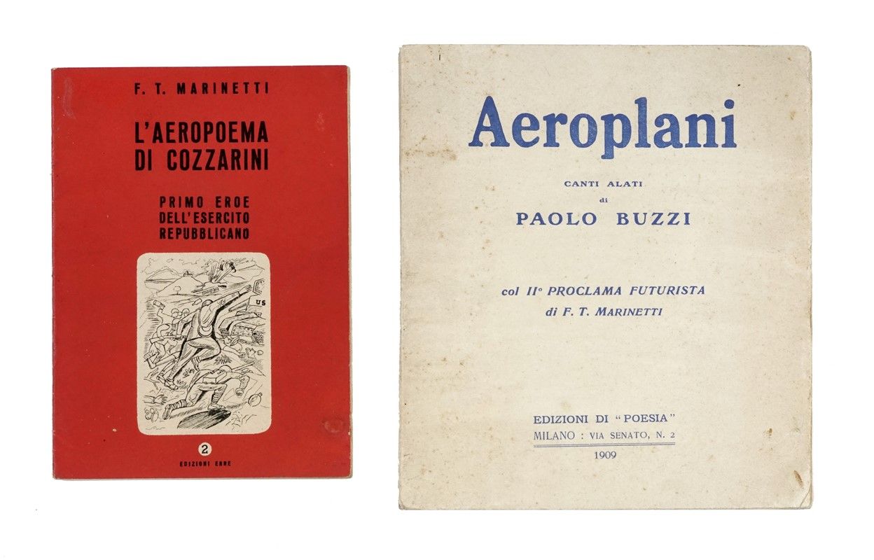 In-8° (mm 187x165). Pagine 249, [7]. Copia parzialmente intonsa e ben conservata, con lievi e diffuse fioriture e alcune leggere e uniformi arrossature concentrate principalmente alle ultime pagine. Brossura editoriale con titoli in blu al piatto anteriore e al dorso, con marchio "Poesia Rassegna Internazionale" al piatto posteriore. Leggere fioriture e qualche segno del tempo alle cerniere e al dorso, ma nel complesso buona conservazione. Con la dedica autografa di Buzzi a Cosimo Giorgieri Contri, poeta, scrittore e drammaturgo italiano, alla prima carta bianca. SI AGGIUNGE: Marinetti Filippo Tommaso, L'aeropoema di Cozzarini. Primo eroe dell'esercito repubblicano. S.l. [i.e. Milano]: Edizioni Erre, s.d. [i.e. 10 maggio 1944]. Brossura editoriale rossa con titoli in nero, illustrata con un disegno di Gino Boccasile.