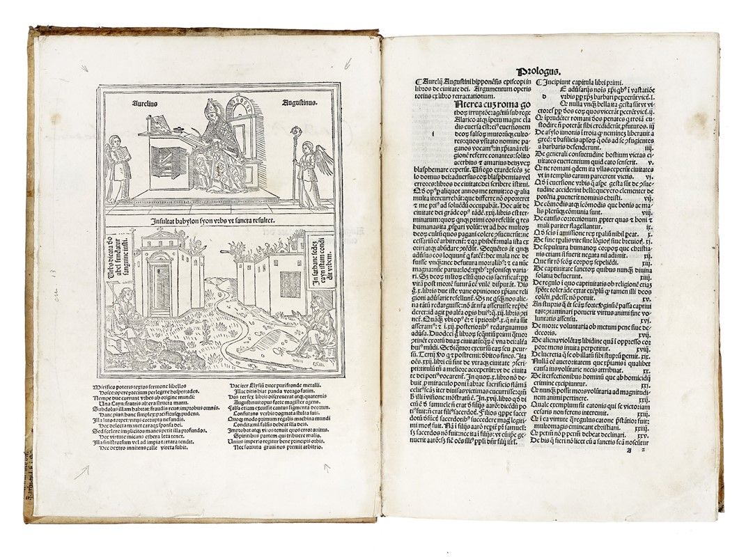 In-folio (mm 315x212). Carte: [264]. Xilografia a 3/4 di pagina al verso del frontespizio, marca tipografica in fine. Testo in gotico su due colonne, circondato dal commento in corpo più piccolo. Pallido alone al margine interno del primo fascicolo e altre trascurabili tracce del tempo, ma nel complesso copia molto fresca in legatura posteriore realizzata con frammento di antica pergamena (un po' sciupata).