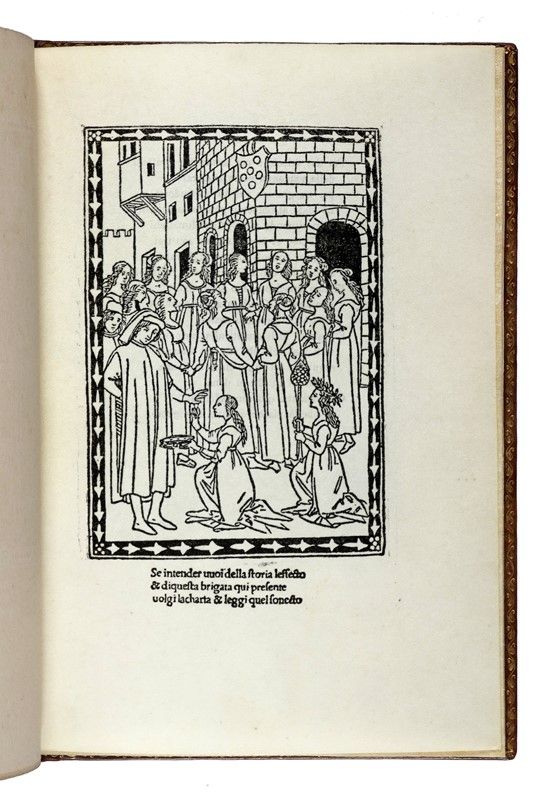 In-8° (mm 242x163). Pagine 72, 3, [1]. Un'illustrazione al frontespizio riproducente il titolo originale e un'altra, raffigurante 12 fanciulle che danzano, in fine di volume. Ottima copia. Legatura in piena pelle con cornice impressa a secco a motivi fitomorfi entro doppia cornice di filetti concentrici dorati; titoli e fregi in oro al dorso a 6 nervi e sguardie marmorizzate. Abrasioni al dorso e segni di usura alle cerniere. Entro cofanetto in pieno cartonato. Tiratura in 75 esemplari numerati.