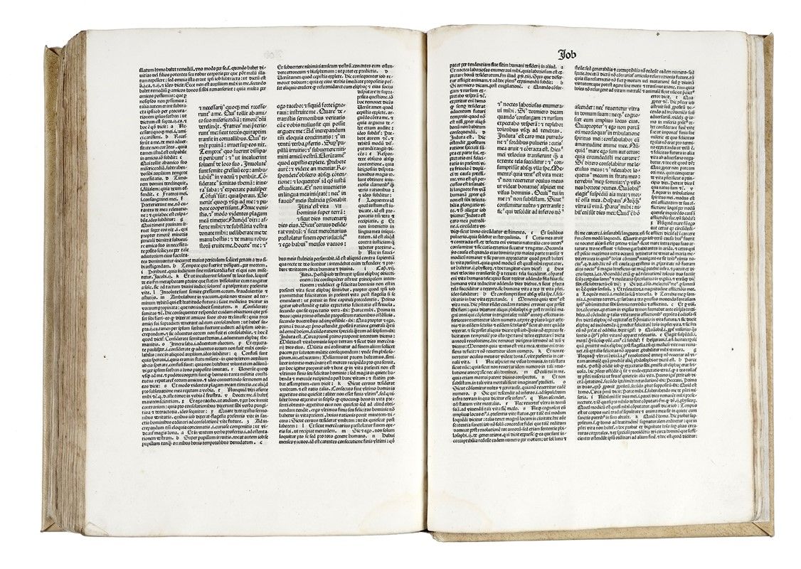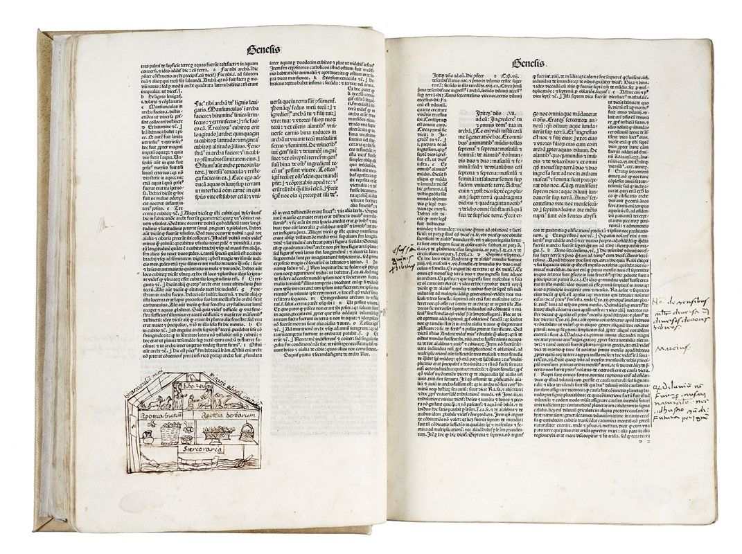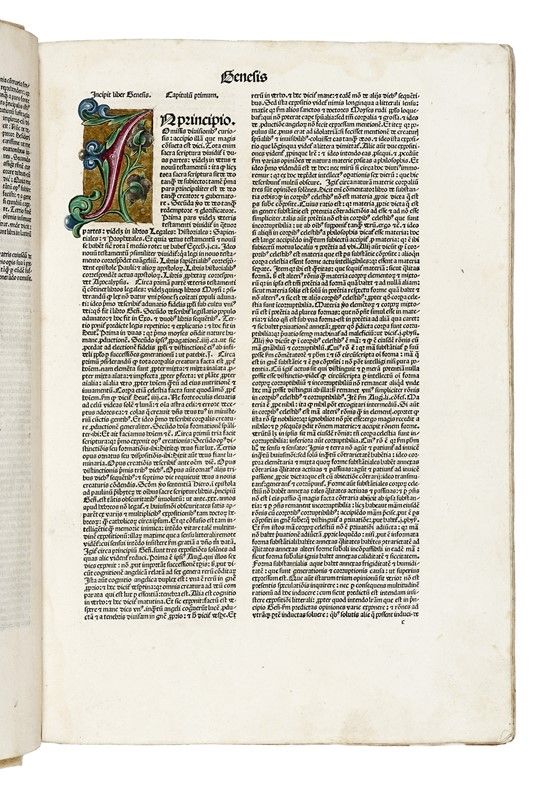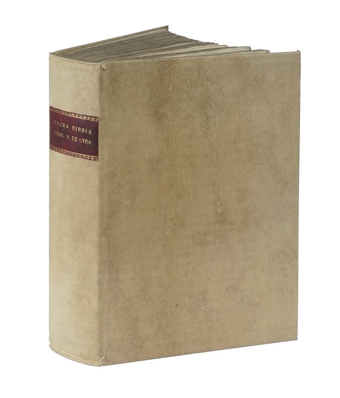 In-folio (mm 313x216). Carte: [431, di 1361, il volume si conclude con il libro di Giobbe]. Segnatura: a-c8 d-f10 g8 h12(-h12) i-k10 l8 m-y10 2a-2l10 2m8 2n-2x10 2y12. Testo in gotico su due colonne, in corpo più grande il testo biblico, più piccolo il commento attorno. Con 4 splendide iniziali miniate e un antico disegno in margine. Iniziale "H" all'inicpit (a2), alta 4.3 cm, miniata in blu, verde e bianco su fondo rosso e oro e con tralcio di mirtilli all'interno; iniziale "F" alla carta a3v, alta 3.5 cm ma con la stanghetta della F che si estende lungo il margine, miniata in rosa, rosso, verde e bianco su fondo oro e con piccolo fiore rosa all'interno; iniziale "F" alla carta a4r, alta 3.9 cm ma con la stanghetta della F che si estende, miniata in azzurro, rosa, rosso, verde e bianco su fondo oro e con piccolo fiore azzurro all'interno; iniziale "I" alla carta c1r, alta 5 cm, miniata in rosa, rosso, verde, blu e bianco su fondo oro. Alla carta d1v, un disegno coevo al margine inferiore raffigura un spaccato dell'Arca di Noè relativo al testo Genesi 6,14-22 presente sulla pagina. Molte antiche postille. Forellini di tarlo ai primi e ultimi fascicoli, margine inferiore di a2 risarcito, margine superiore delle carte p6-8 con strappo senza perdite, qualche minimo alone marginale e altre trascurabili tracce del tempo, ma nel complesso bellissima copia fresca, completa anche della prima carta bianca (stessa filigrana della carta k4). In pergamena rigida moderna con tassello rosso al dorso.