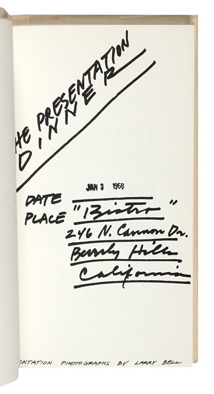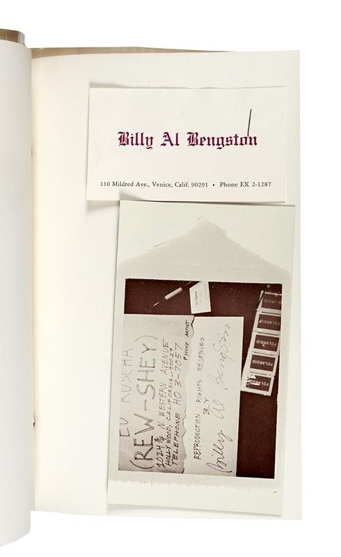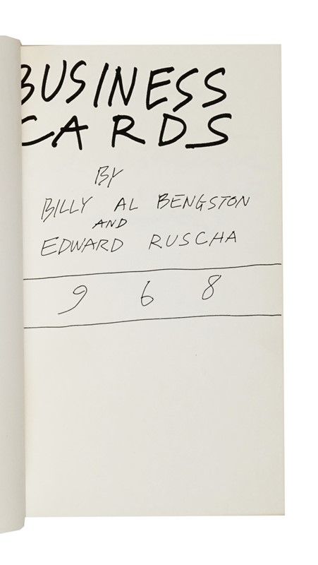 In-8° (mm 224x143). Carte [14] con le riproduzioni di fotografie di Larry Bell e Ken Price e i biglietti da visita di Ed Ruscha e Al Bengston spillati al recto dell'ultima carta. Brossura originale effetto legno, con cordoncino in pelle e una fotografia originale degli Artisti montata con angoli fotografici al piatto anteriore. Firma autografa di Ed Ruscha e Al Bengston al piatto anteriore. Ottima copia, con lievi bruniture da esposizione alla fotografia e minimi segni di usura ai legacci in pelle, che risultano integri.