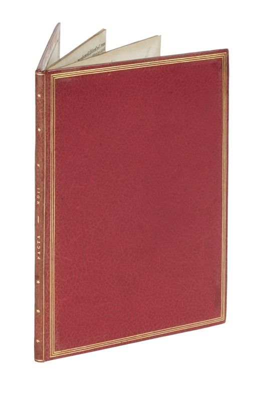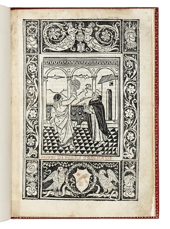 In-4° (mm 194x137). Carte: [4]. Frontespizio con xilografia a piena pagina, testo in romano su 2 colonne. Impercettibili restauri agli angoli, carte uniformemente ingiallite, ma per il resto buona copia in bellissima legatura moderna in marocchino rosso, piatti riquadrati da triplo filetto dorato, dorso liscio (leggermente sbiadito) con titoli dorati, unghiatura con filetto dorato, contropiatti con fini dentelles dorate. Antica firma di appartenenza al frontespizio.