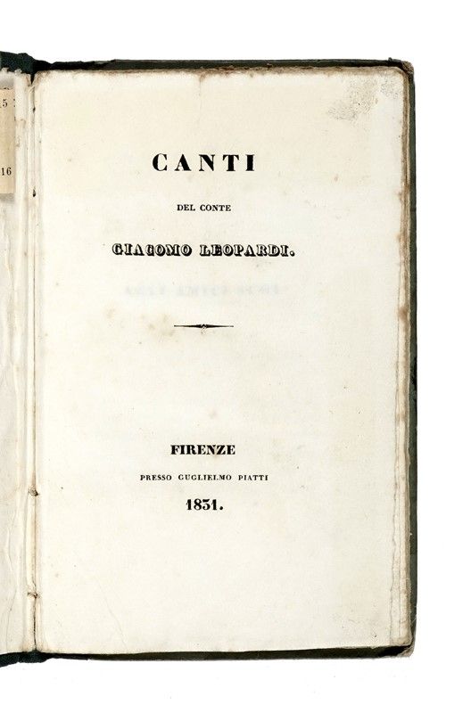 In-8° (mm 158x100). Pagine 165, [1]. Buon esemplare in barbe, con usuali fioriture e con i margini di alcune carte più corti. Il verso dell'ultima carta risulta parzialmente incollato, nel margine interno, al foglio di guardia posteriore. Allentate, ma ben conservate, le pagg. 109-116. Legatura editoriale in cartonato verde con titoli in nero al piatto anteriore e fregio a quello posteriore entro cornice tipografica. Dorso rifatto, fioriture ai piatti e abrasioni agli angoli. Mancante il foglio di guardia anteriore. Annotazioni nel testo.