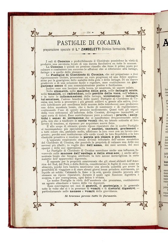 A p. 54, le pastiglie di cocaina per sedare la tosse..., Milano: Tipografia Bernardoni Di C. Rebeschini eC., s.d. (circa 1890).