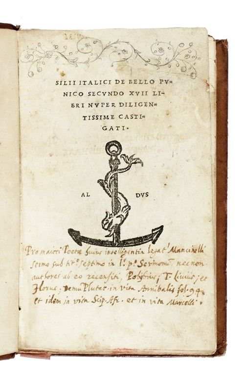 In-8° (mm 159x99). Carte: 210, [1], assente l'ultima carta D4 con la marca editoriale. Frontespizio con ancora aldina e capilettera dipinti a mano, copia difettosa con restauri e segni del tempo. Esemplare con sguardie decorate con motivi marmorizzati e tagli rossi. Piena pelle ottocentesca con decorazioni a secco ai piatti e filetto in oro, dorso con fregi e titoli dorati entro tassello, qualche abrasione e sbucciatura.